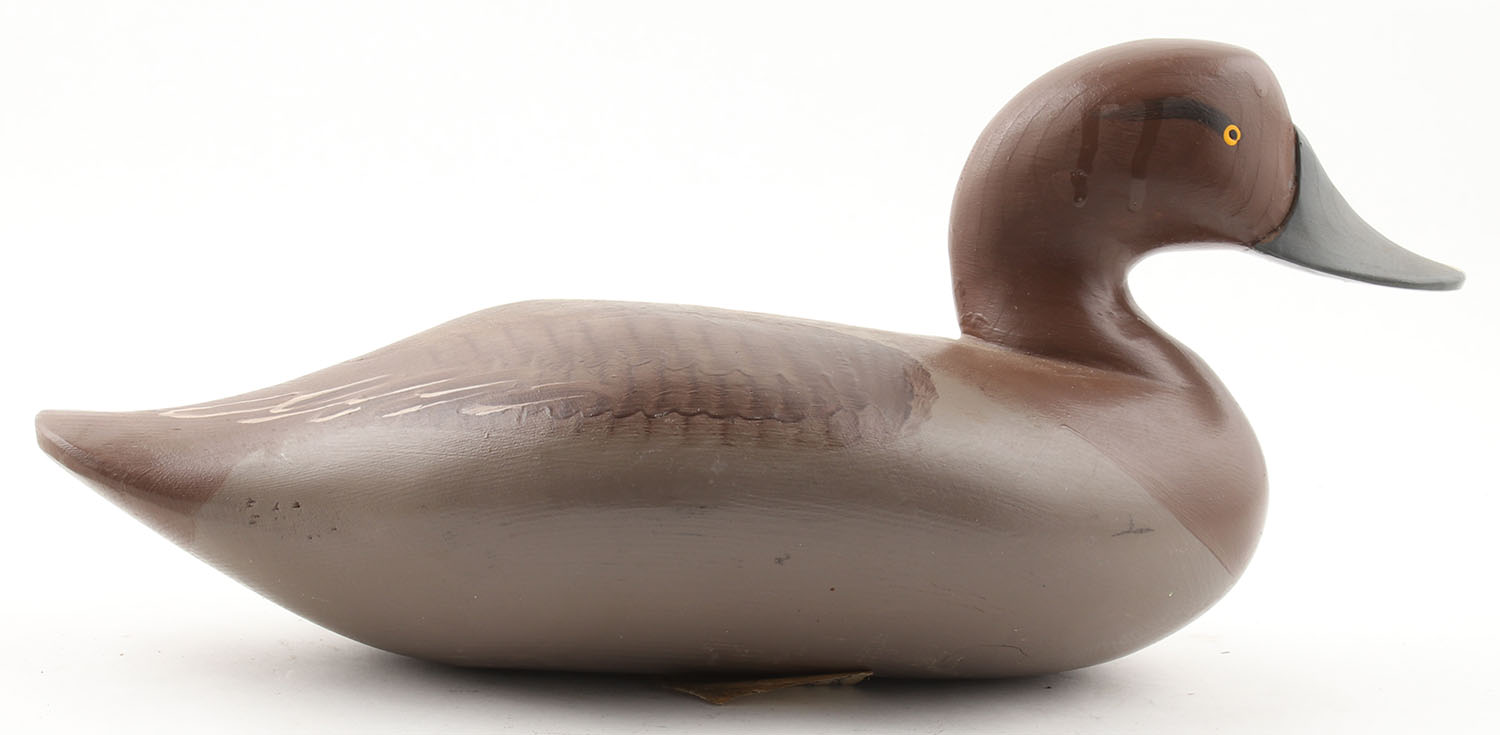 Bluebill Hen by James Pierce, Lansdowne, PA, 1965-66, painted eyes, solid wood, original paint, structurally excellent, stamped ''GFH'' on bottom, 14 1/2'' OAL. Grade: Excellent - Value: 40 to 80