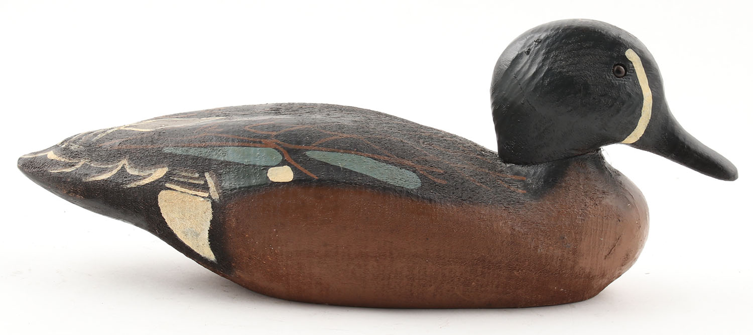 Bluewing Teal by Herter's Inc., Waseca, MN, 1893 Series, glass eyes, solid wood, original paint, structurally excellent, 12 1/2'' OAL. Grade: Excellent - Value: 40 to 120