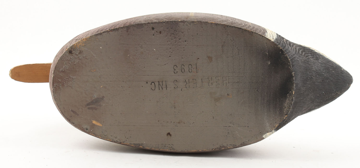 Mallard Drake by Herter's Inc, Waseca, MN, 1893 Series, glass eyes, solid wood, original paint, structurally excellent, stamped on bottom, 15'' OAL. Grade: Excellent - Value: 50 to 400