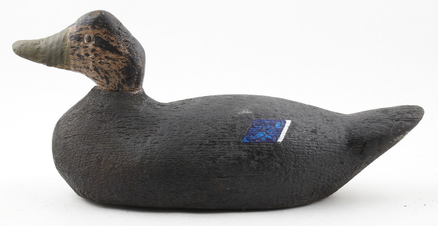 Black Duck by Unknown Maker, raised painted eyes, solid wood, repaint, structurally sound, some cracks at breast, 15 1/2'' OAL. Grade: Very Good - Value: 30 to 60