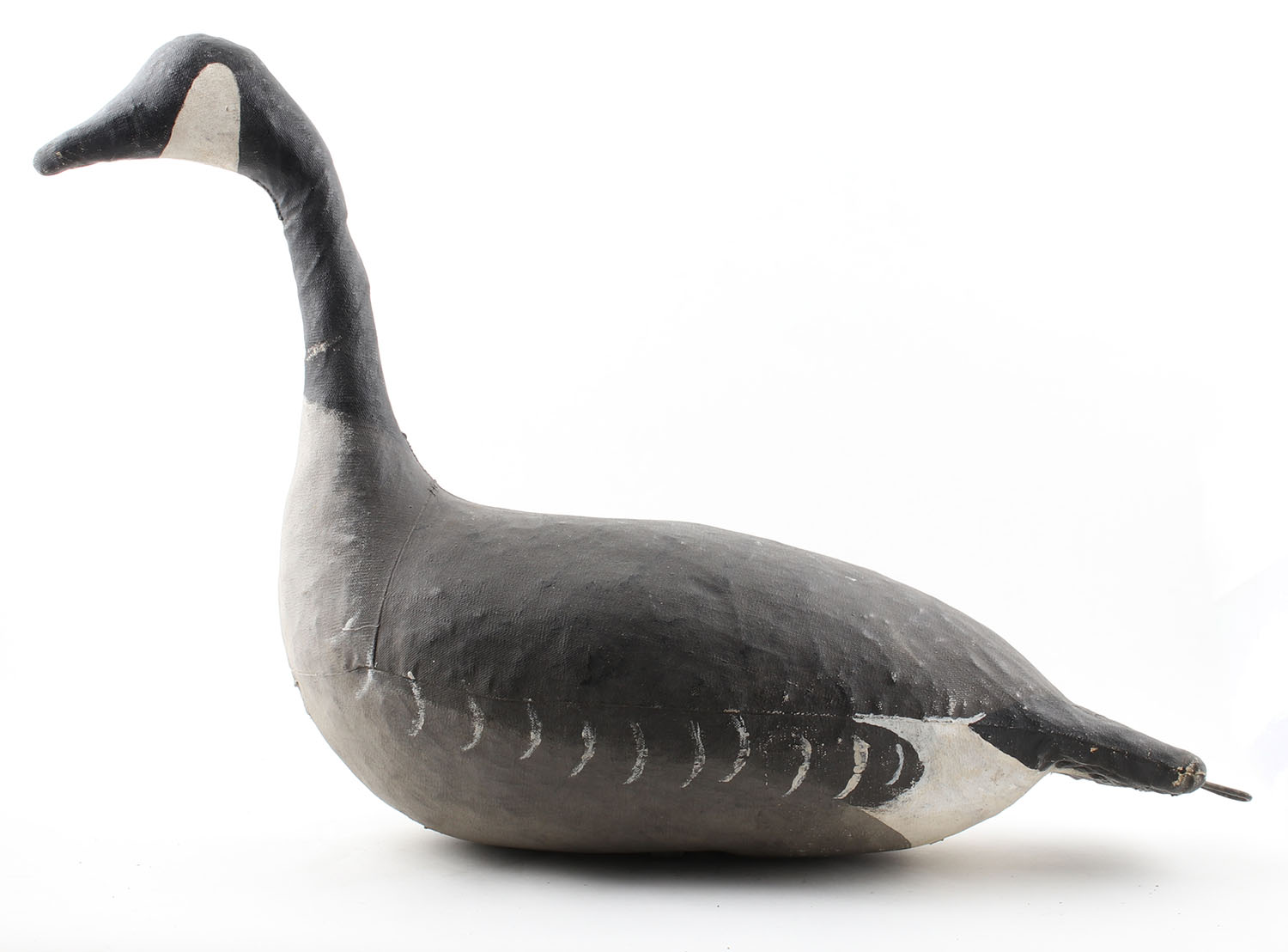 Canada Goose by Unknown Maker, no eyes, canvas, original paint, structurally sound, 28'' x 20'', has hole in bottom for stand. Grade: Excellent - Value: 20 to 60