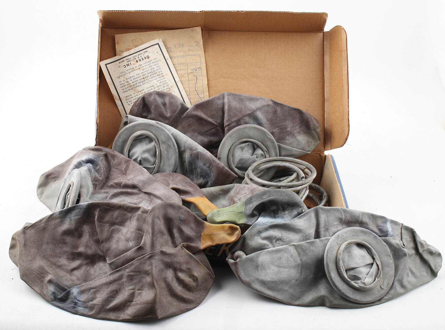 Mallard Decoys by Deeks, 6 rubber decoys & weighted rings, comes in original box with instructions. Grade: Very Good - Value: 10 to 50