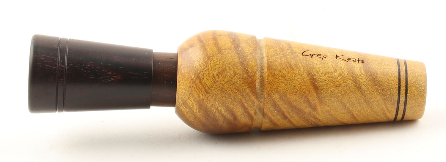 Greg Keats Duck Call, Rockville, MD, marked on barrel, burled wood, plastic reed, 5'' OAL. Grade: Excellent - Value: 80 to 160