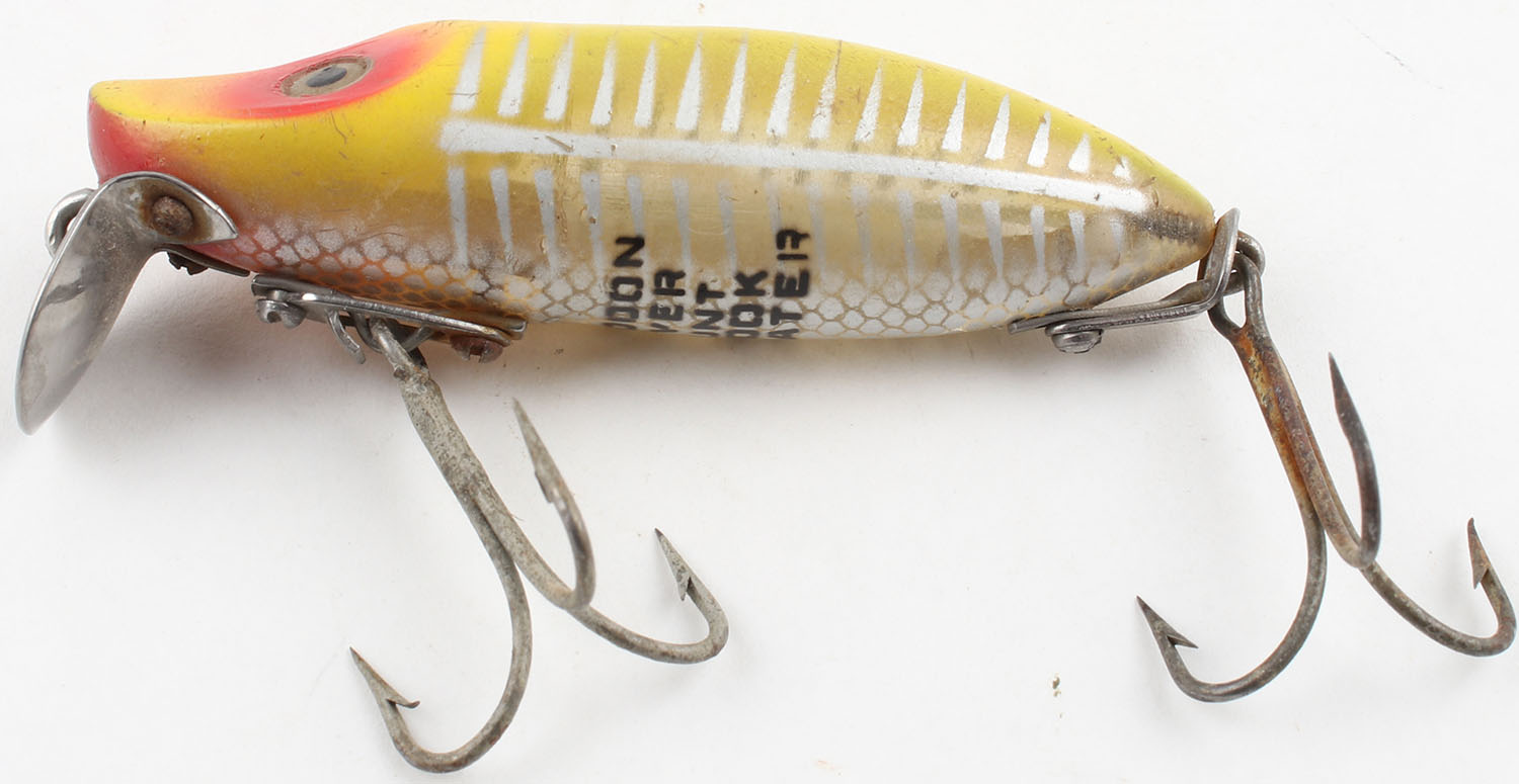Heddon River Runt Spook Floater, plastic lure, PE, clear/yellow/silver/red, floating rig, 2 hooks, fixed blade, marked on belly, 3'' OAL. Grade: Excellent - Value: 8 to 40