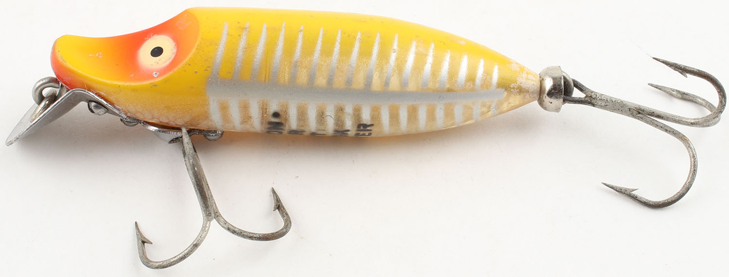 Heddon River Runt Spook Floater, plastic lure, PE, clear/yellow/silver/red, floating rig, 2 hooks, fixed blade, marked on belly, 3'' OAL. Grade: Excellent - Value: 8 to 40