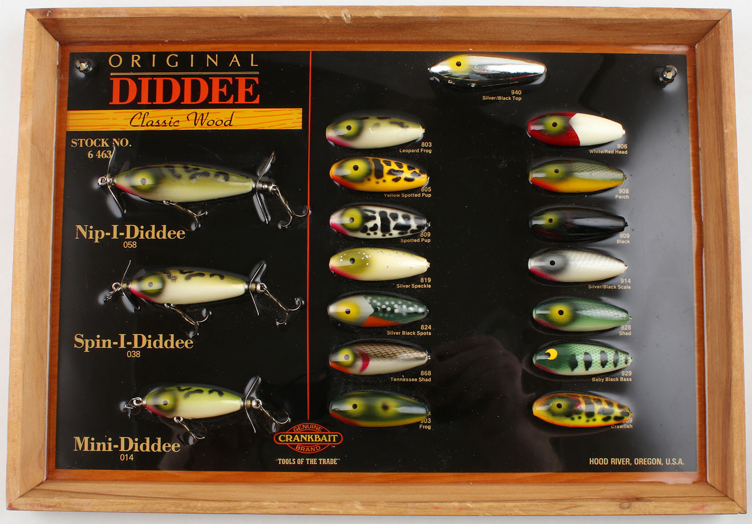 Original Diddee Salesman Display Board, Classic Wood, Stock # 6463, Issued 11/28/1988, Board #80. A nice display board with a variety of lures. Grade: Excellent ++ - Value: 100 to 500