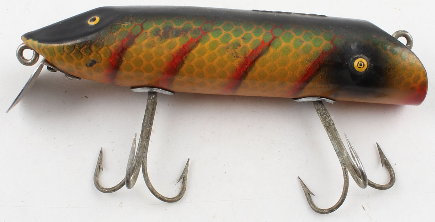 South Bend Two-Obite, plastic lure, TE, yellow/green/black with gold scales, black/red stripes, 2 hooks, marked on back, 3 3/4'' OAL. Grade: Excellent - Value: 30 to 100