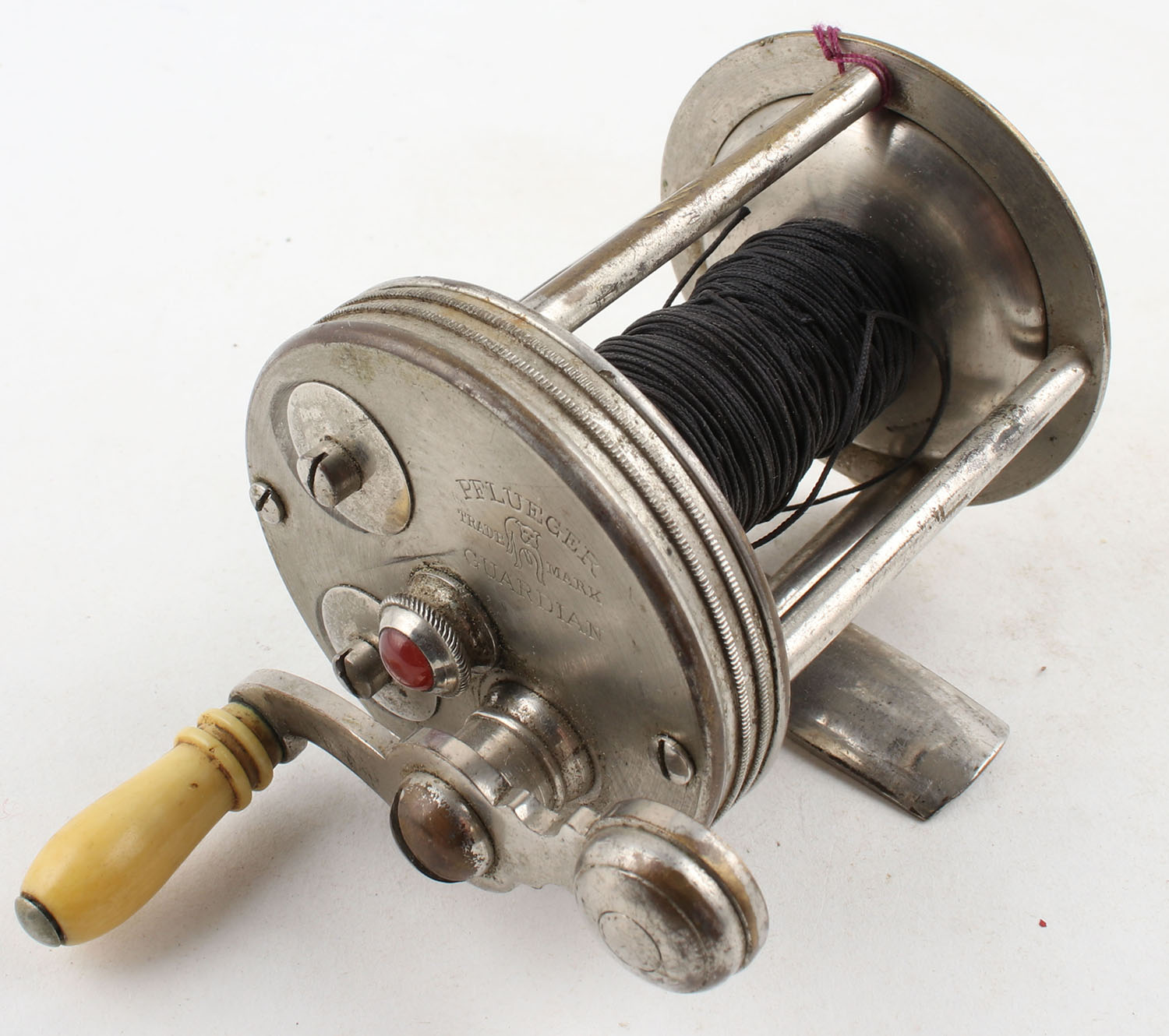 Pflueger Guardian, 60yds, single handle, red JWL, bull dog logo, marked on side plate, smooth turn & intermittent light clicks. Grade: Very Good - Value: 10 to 50