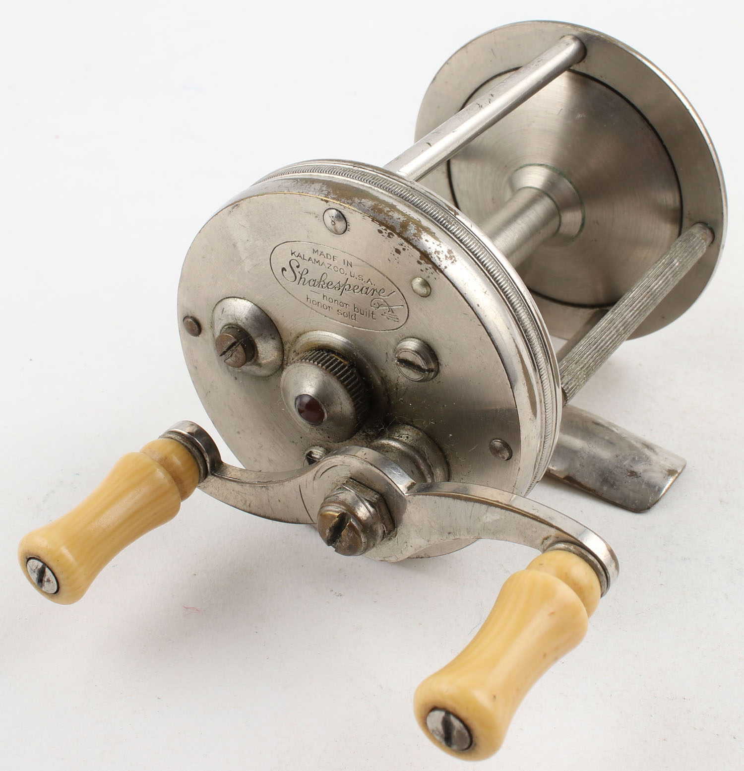Shakespeare Precision 1924 Model, #23041, 100yds, small red JWL, dual handle, marked on side plates & reel seat, very smooth turn & strong clicks. Grade: Excellent - Value: 8 to 40