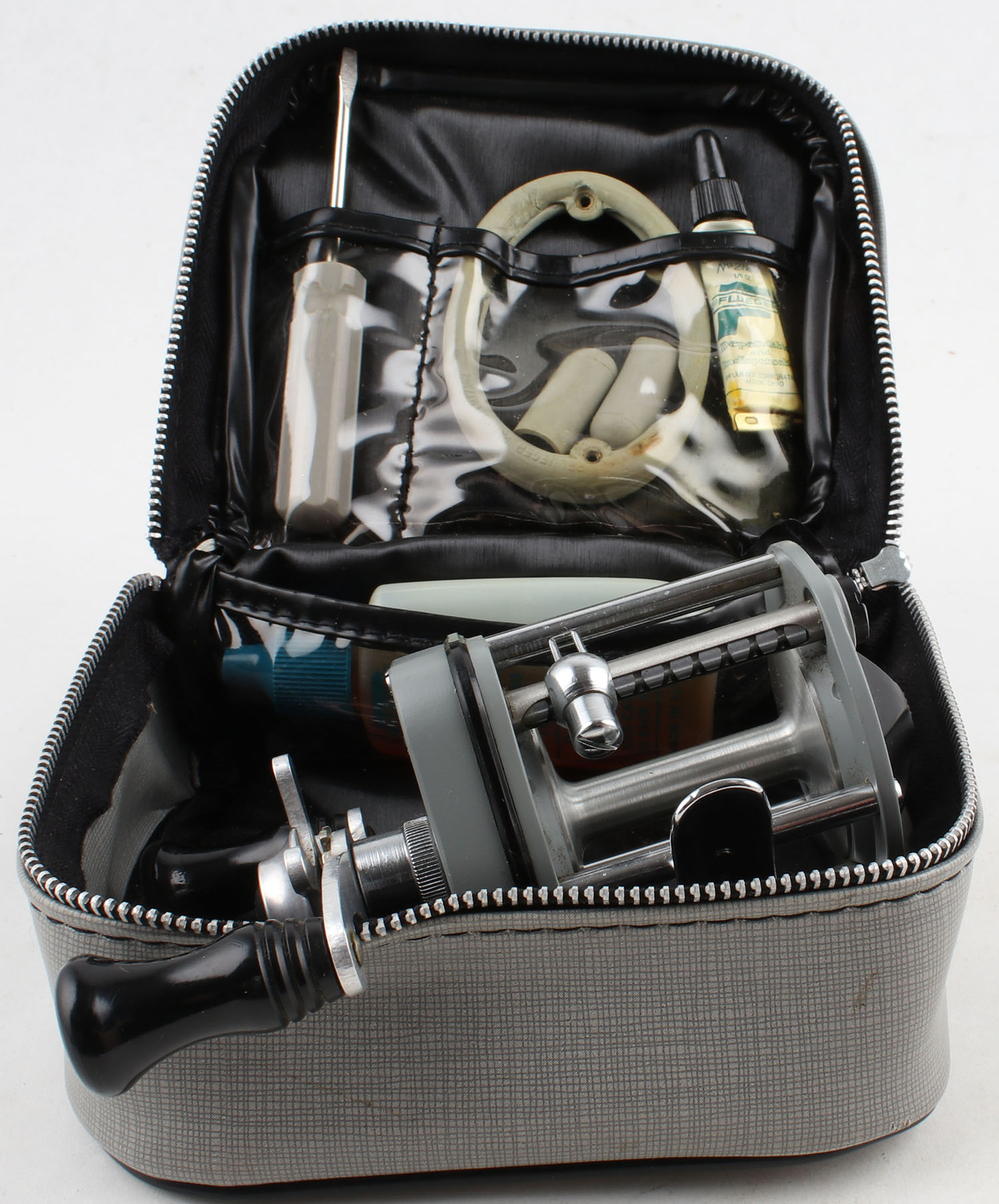 CASED, Pflueger Supreme 510, no yardage mark, dual handle, marked on side plate, smooth reel turn, some areas of tension, clear clicks, comes in Pflueger Supreme soft case, with tool, oil & rubber seals. Grade: Excellent - Value: 10 to 50