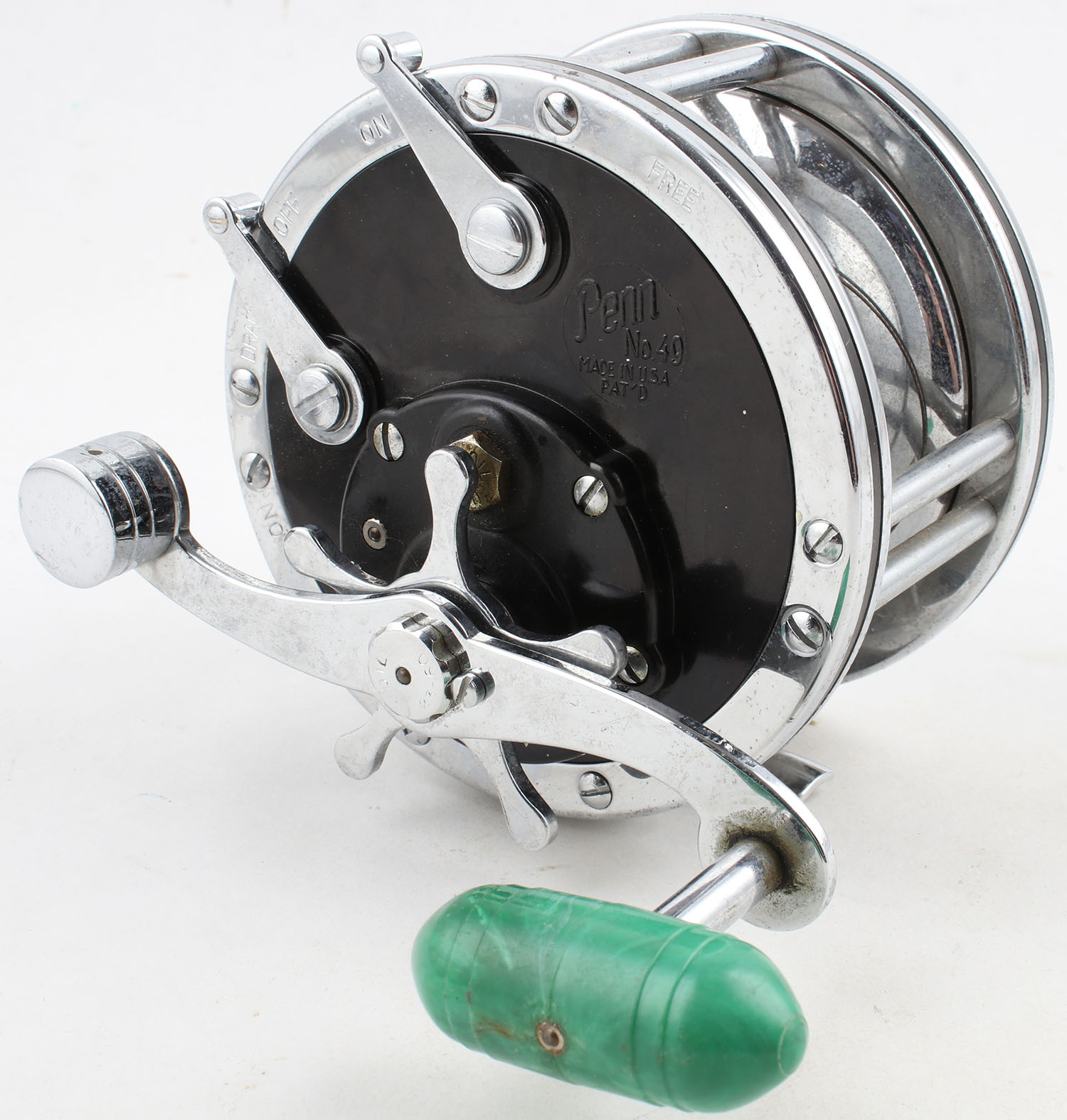 Penn No. 49 Super Mariner, marked 30-49 on reel seat, single handle, very smooth reel turn, clear light clicks. Grade: Excellent - Value: 20 to 60