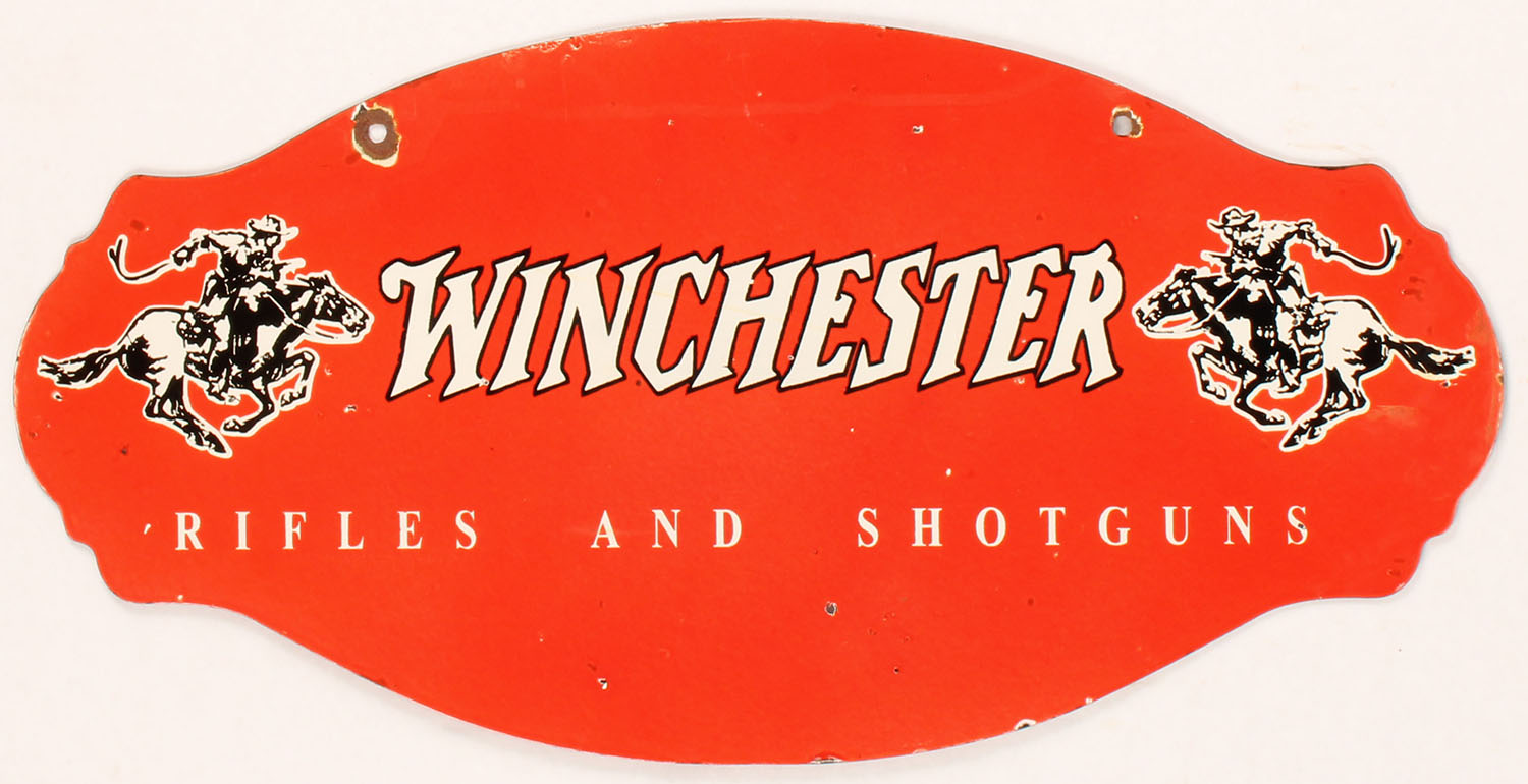 Winchester Porcelain Metal Sign, ''RIFLES AND SHOTGUNS'', double sided, red/black/white sign, Excellent colors, Minor edge loss around the hanging holes, Circa 2000, To be hung on bracket, not included 24'' x 12''. Grade: Excellent - Value: 200 to 400