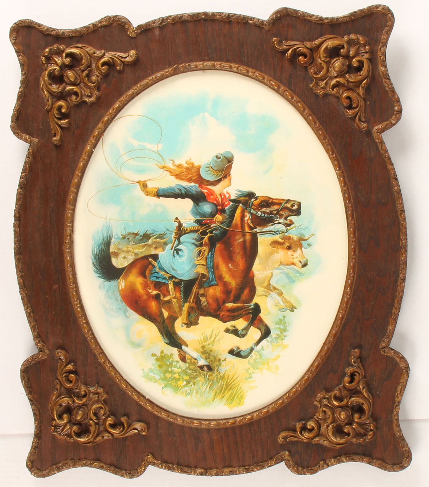 Reproduction Print of a cowgirl roping a bull, good colors, nicely framed, 26'' x 22'' w/frame. Grade: Excellent - Value: 20 to 100