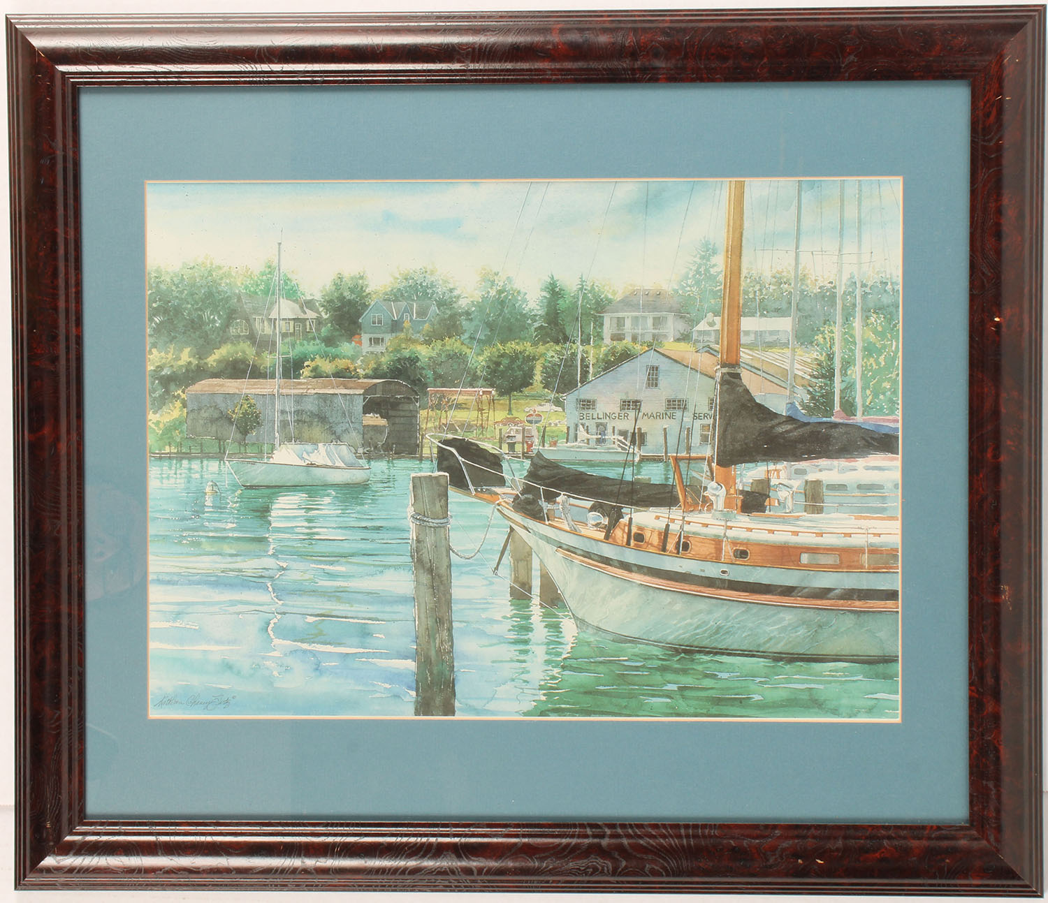Kathleen Chaney Fritz print, pictures a large sail bot coming into the Bellinger Marine Service Marina, excellent colors & detail, nicely framed, 20'' x 14'' image size. Grade: Excellent - Value: 40 to 120