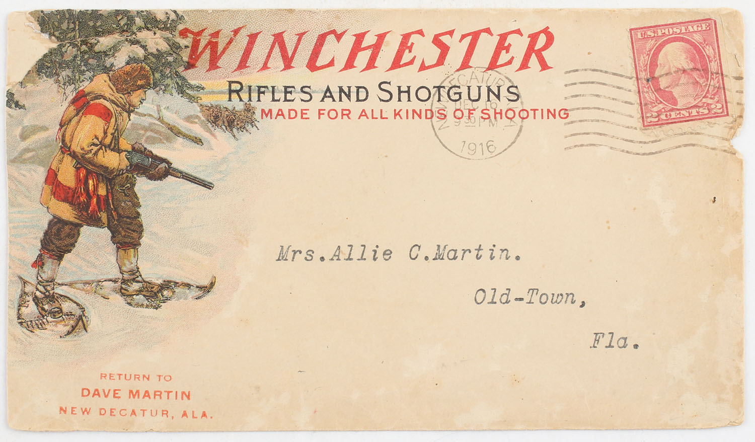 Winchester Rifles & Shotguns Envelope, ''MADE FOR ALL KINDS OF SHOOTING'', 1916, fantastic full color image of a hunter snowshoeing, light age soiling, a couple small edge tears. Grade: Very Good++ - Value: 20 to 80