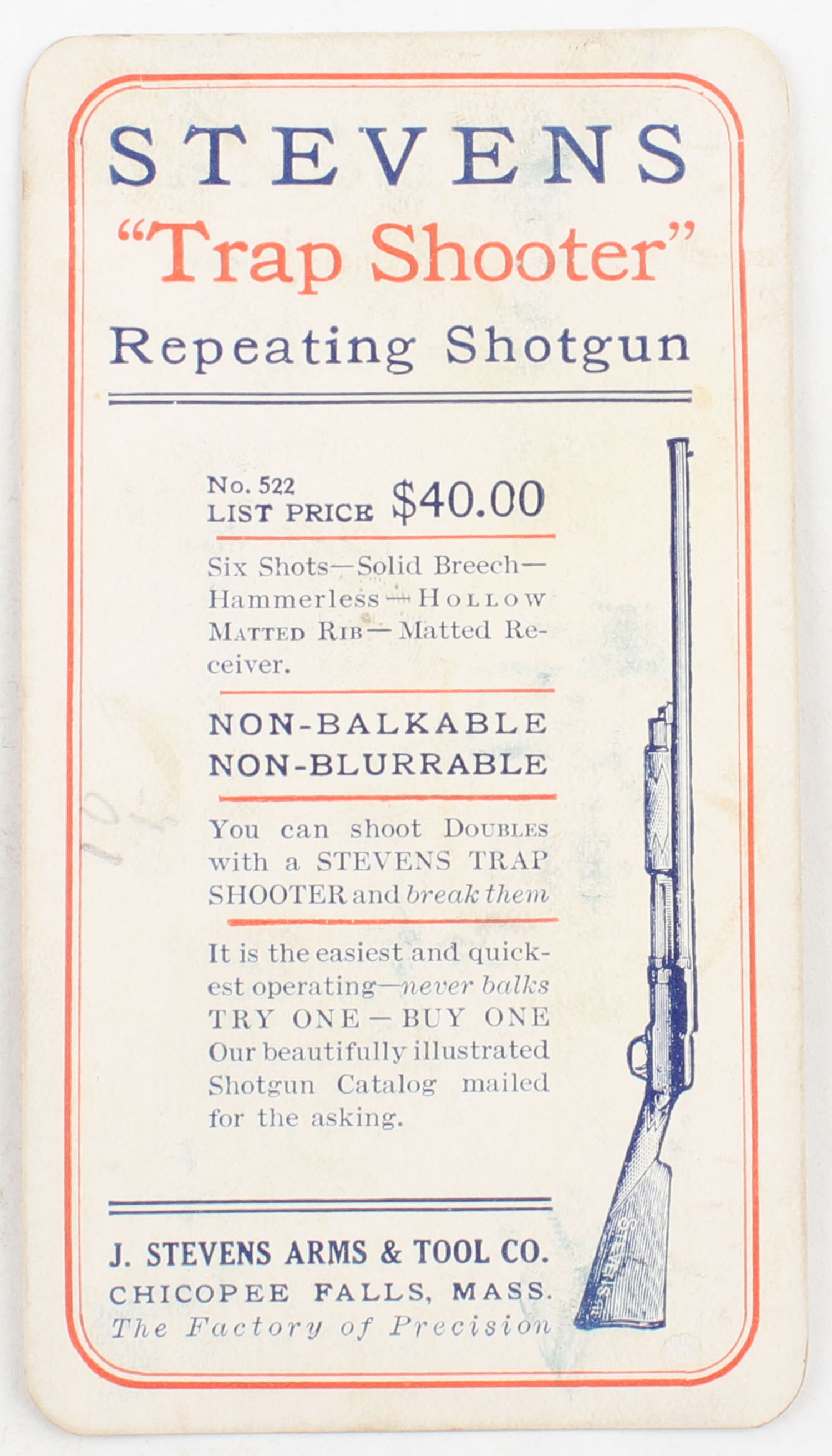 J Stevens Arms & Tool Co. Stevens ''TRAP SHOOTER'' Score Card, has info on front & scorecard on back, light age soiling, pencil writing on back . Grade: Very Good - Value: 10 to 50
