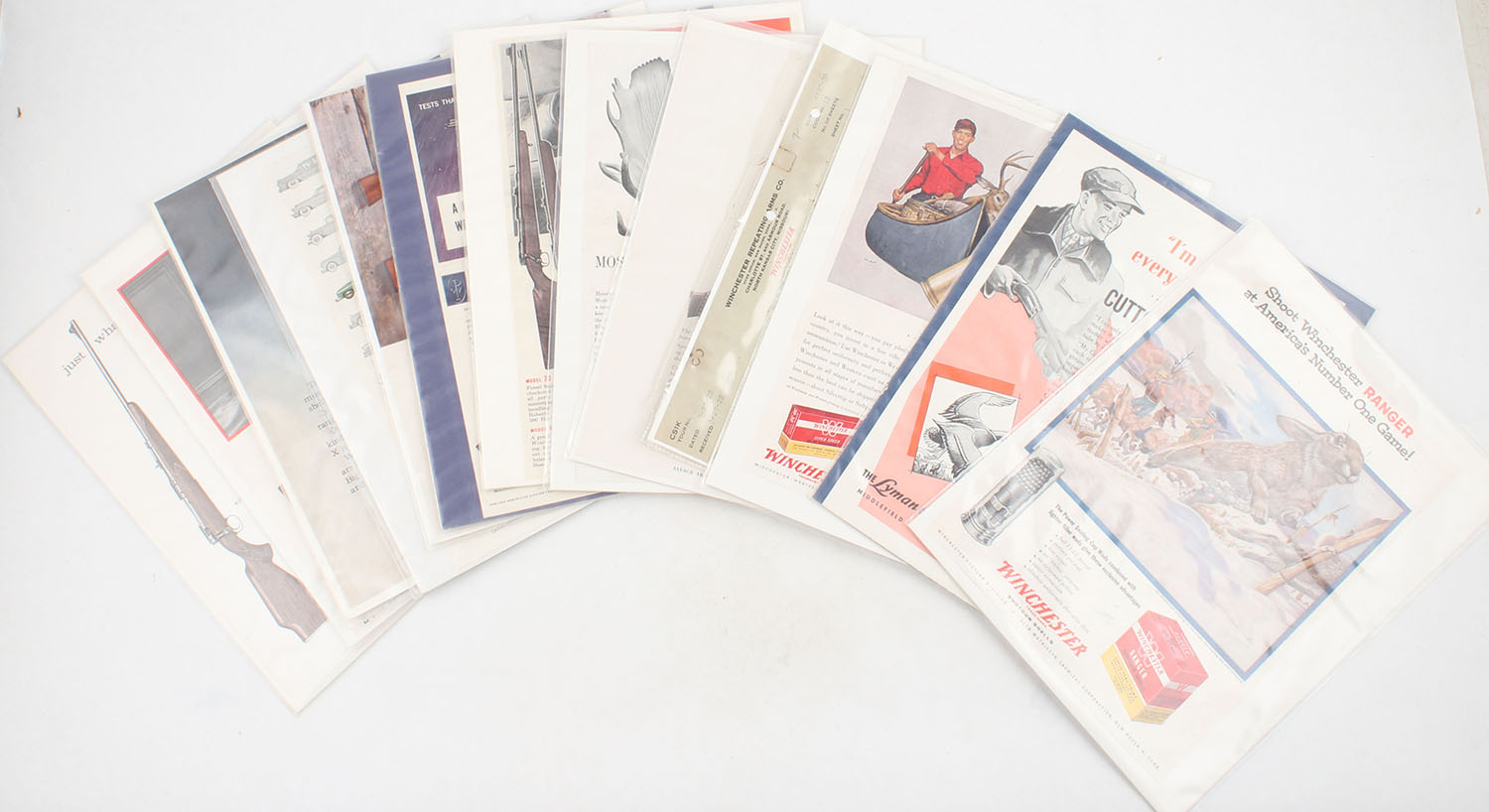 Large Lot of cut-out advertisements for Winchester & Savage, all are in clear sleeves. Grade: Excellent - Value: 6 to 30