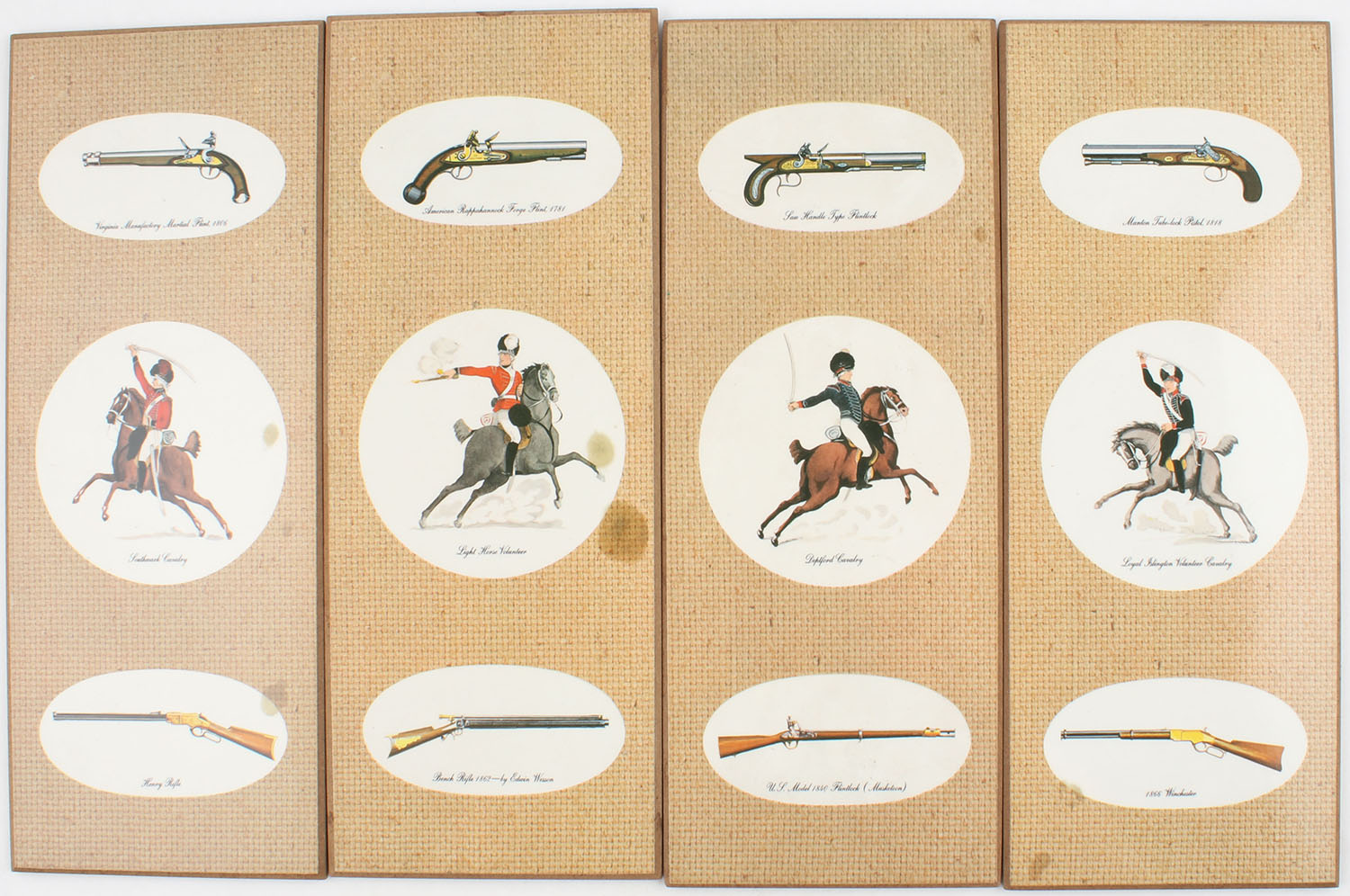 Lot of 4 Cavalry Hanging Plaques, images are laminated onto press board, they each display a specific type of cavalry & the weapons they used, some minor spot staining. Grade: Very Good++ - Value: 6 to 30