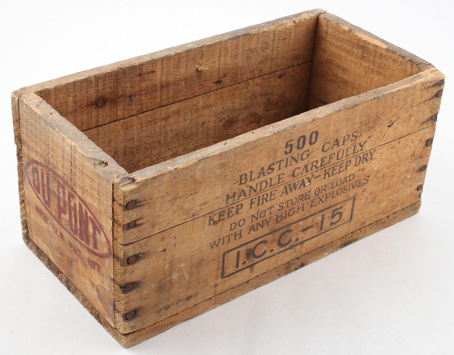 DuPont No.6 Blasting caps wood crate, red and black print is solid and crate is solid . Grade: Very Good ++ - Value: 10 to 40