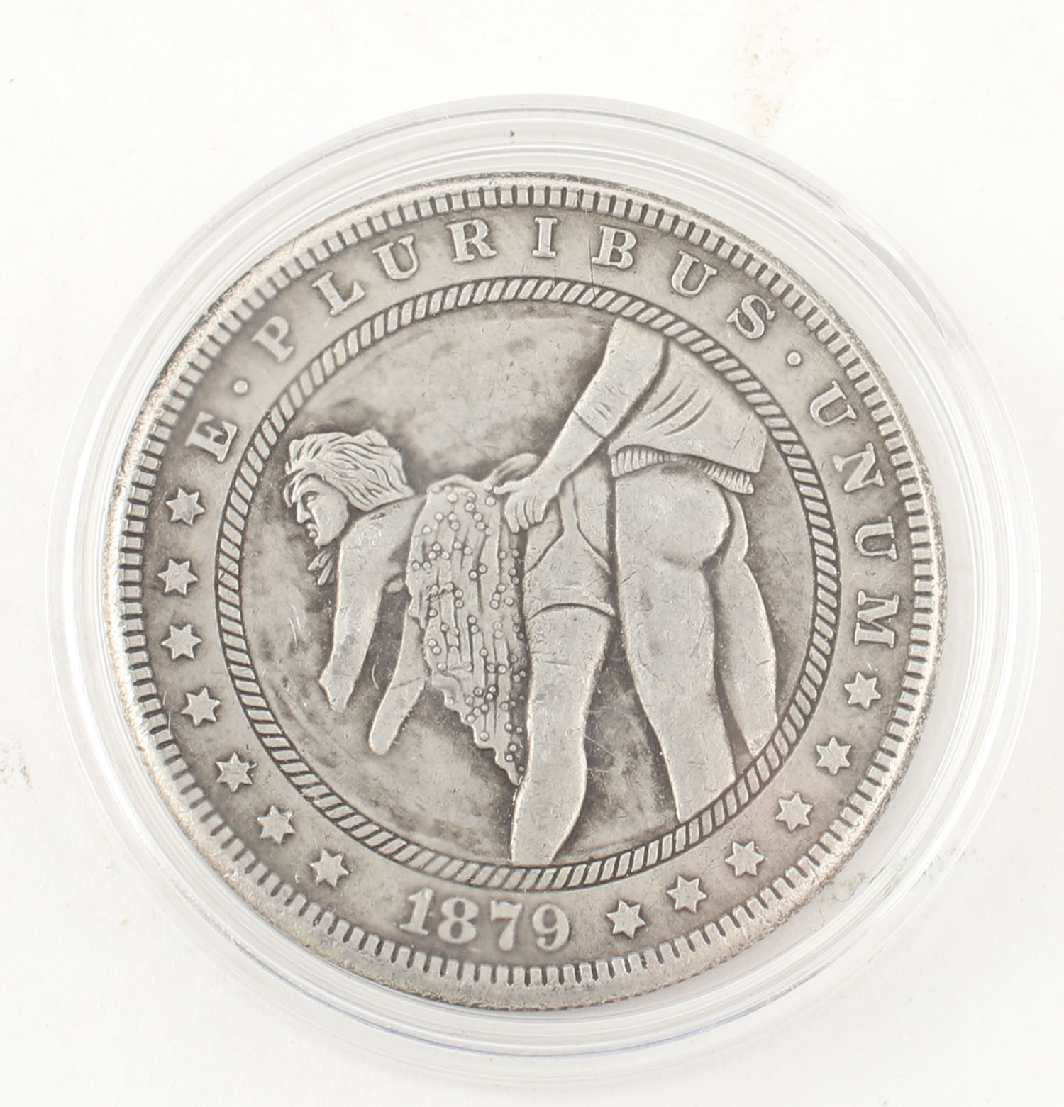 Rare nude silver dollar coin with eagle on back dated 1879. Grade: Excellent - Value: 50 to 250