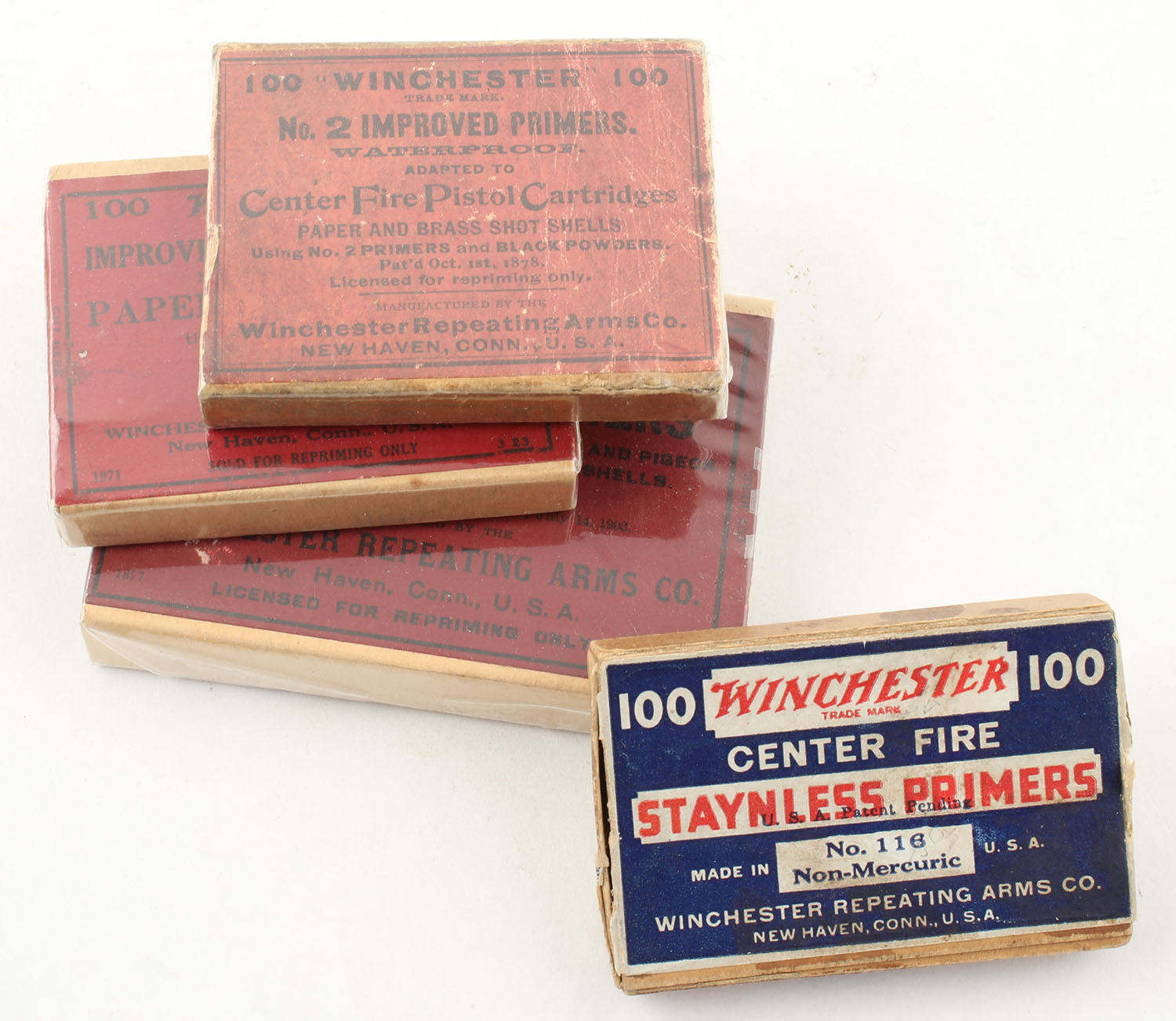 Lot of 4 Winchester primer boxes, 3 partial and 1 Empty. Grade: Very Good - Value: 10 to 50