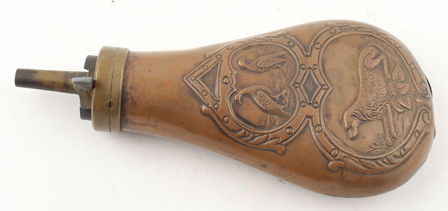 Antique Brass powder flask, double side with images of a dog and 2 birds. Grade: Excellent - Value: 30 to 90