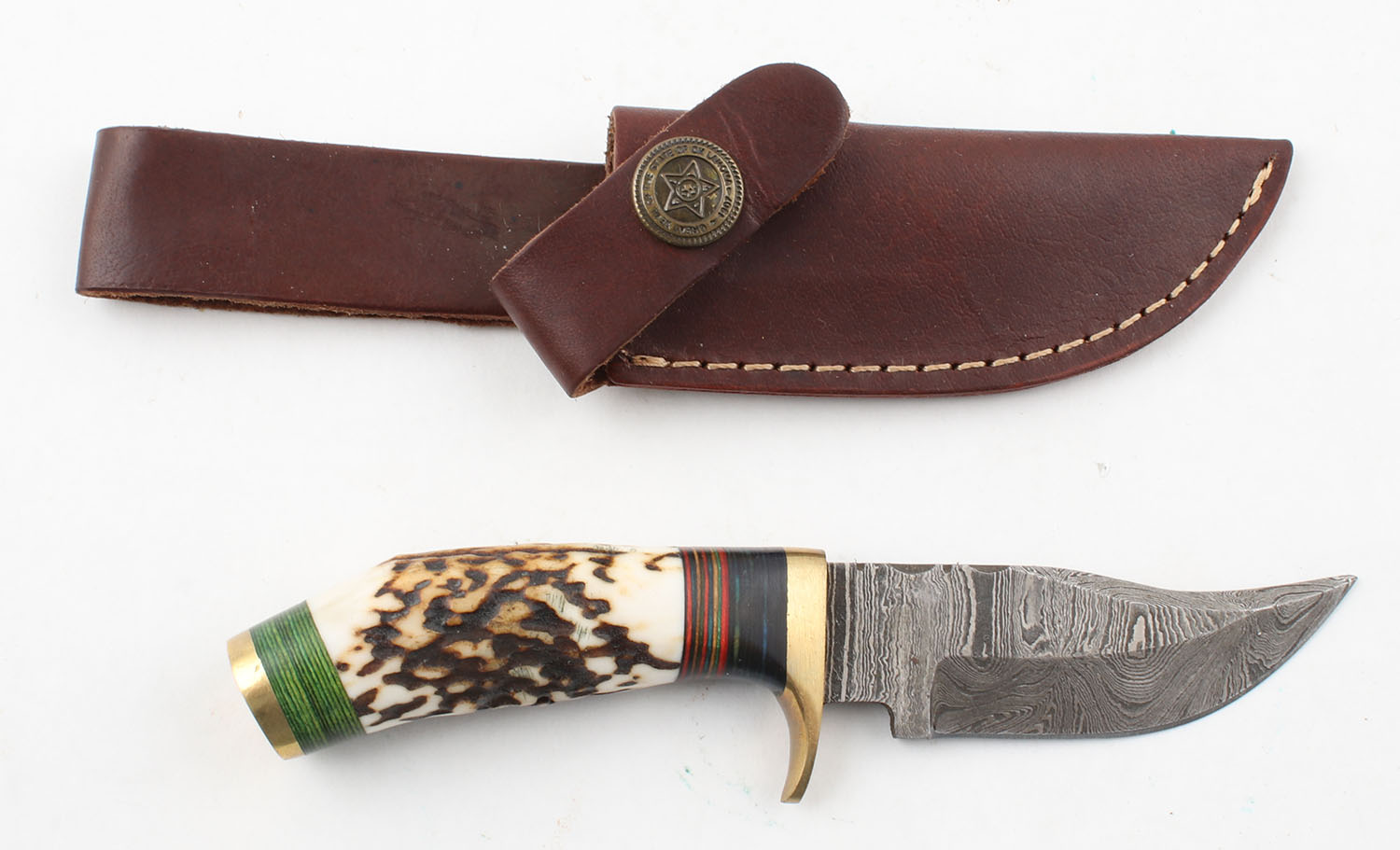 Vintage new old stock state of Oklahoma Seal on sheath snap, hand forged Damascus blade skinning knife with bone handle with leather spacers heavy brass hilt and leather sheath, 6'' Oal, Unused. Grade: Excellent - Value: 20 to 150