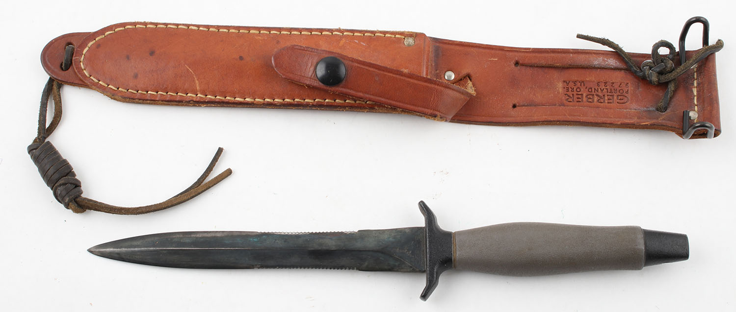 RARE! Gerber MK-II fighting knife, circa Vietnam era, fixed blade, in leather sheath, 6.5'' blade, #020836, some discoloration to blade. Grade: Excellent - Value: 500 to 1000