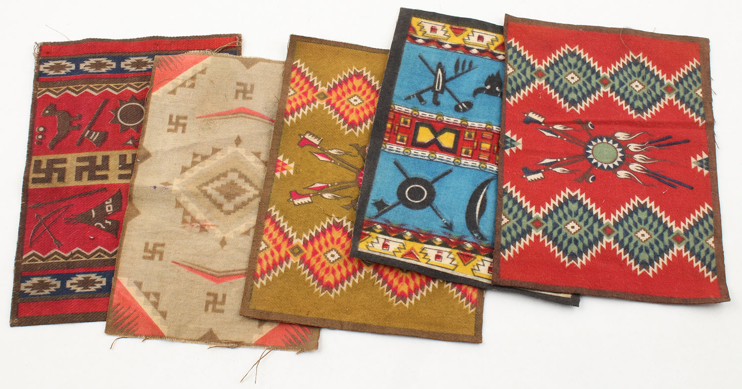 RARE lot of 5 Native American designed felts from about 1900.Vintage tobacco felt rugs, also known as tobacco silks or flannels, were given out as premiums with the purchase of various cigarette and cigar products between approximately 1900 and 1920. These were small textile items, typically made of felt or silk, that were inserted into tobacco product packaging or available by redeeming coupons. Grade: Excellent - Value: 50 to 500