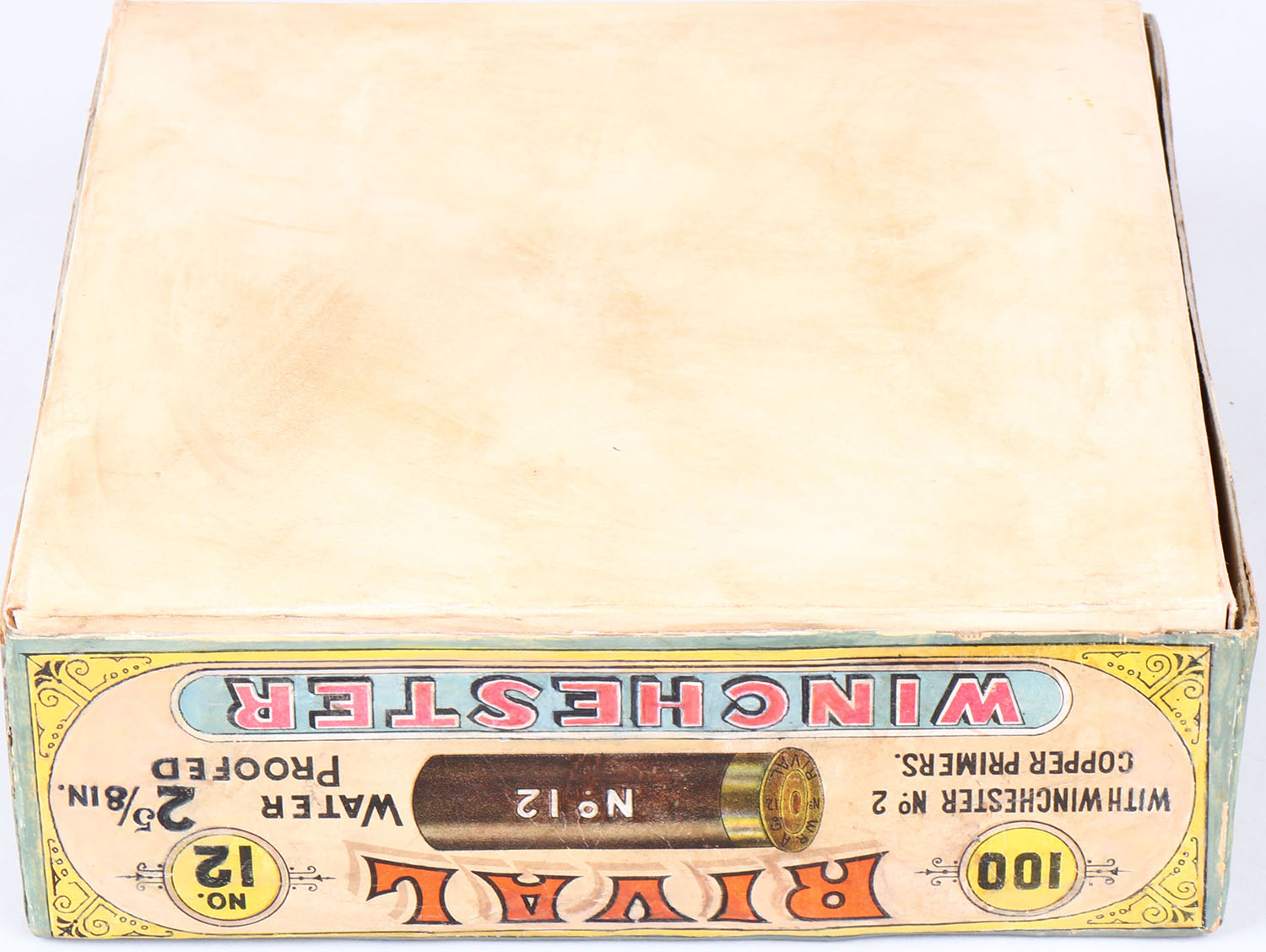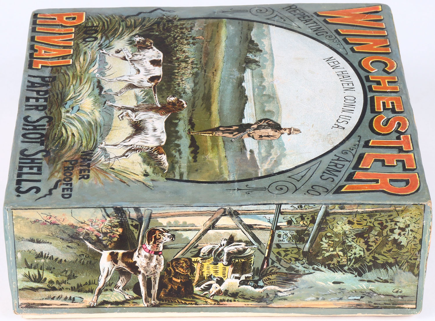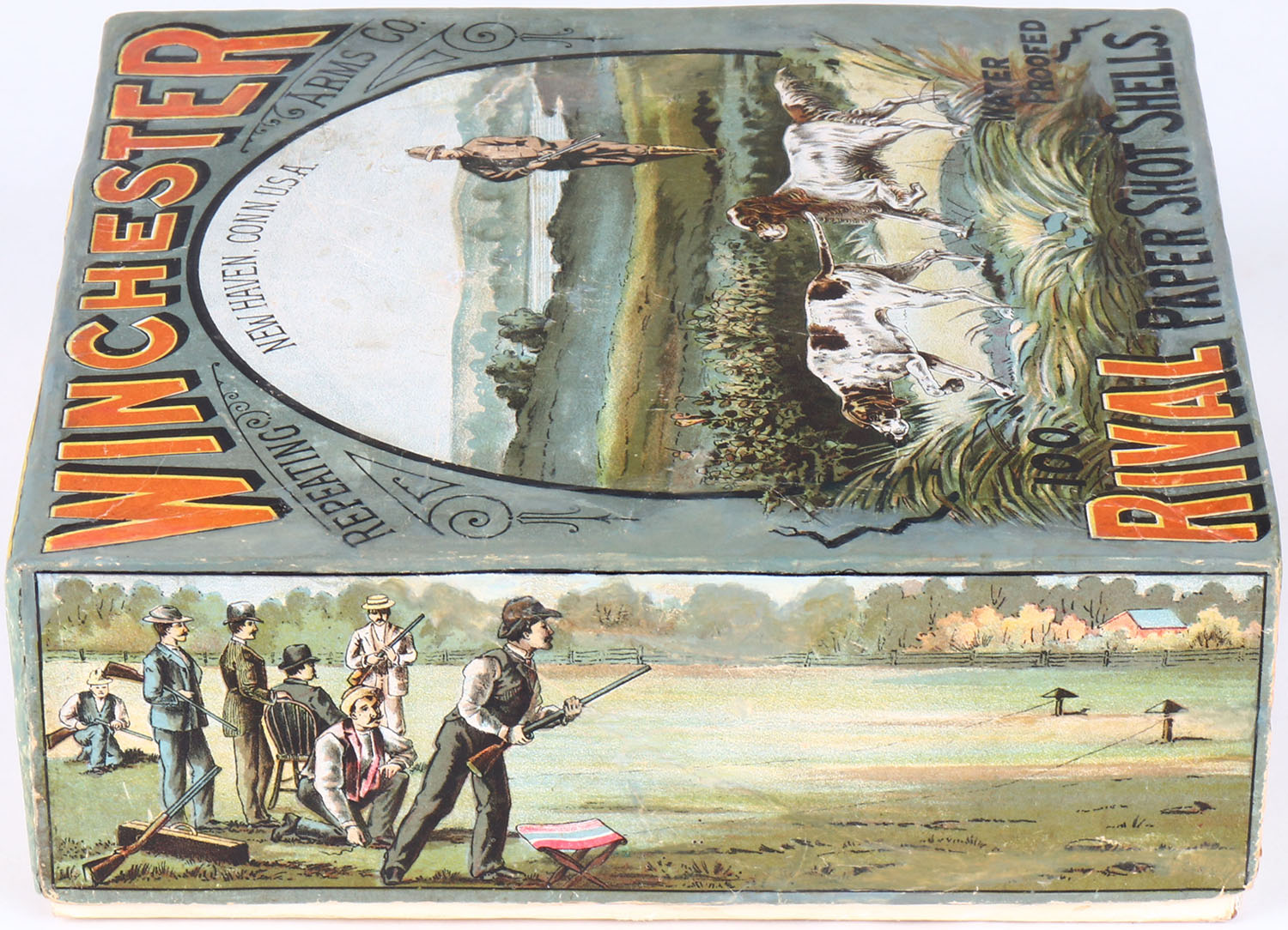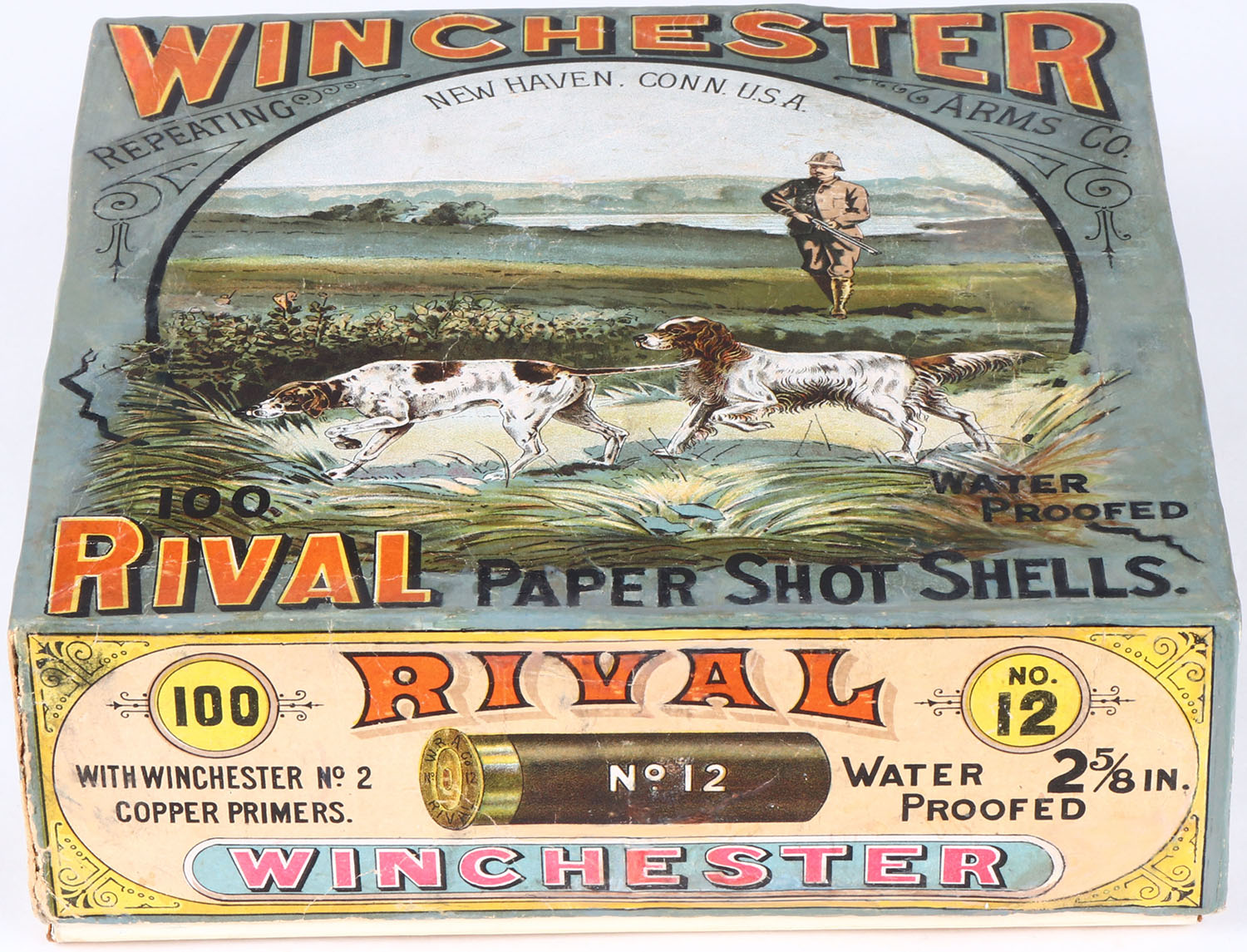 Winchester Rival 100ct. Christmas Box, EXTREMELY RARE, 12ga, 2pc., Empty, 2 5/8'', multi colored box with hunter and two dogs on top label, box has light age soiling, light edge wear, box has been professionally touched up. Grade: Excellent ++ - Value: 10000 to 20000
