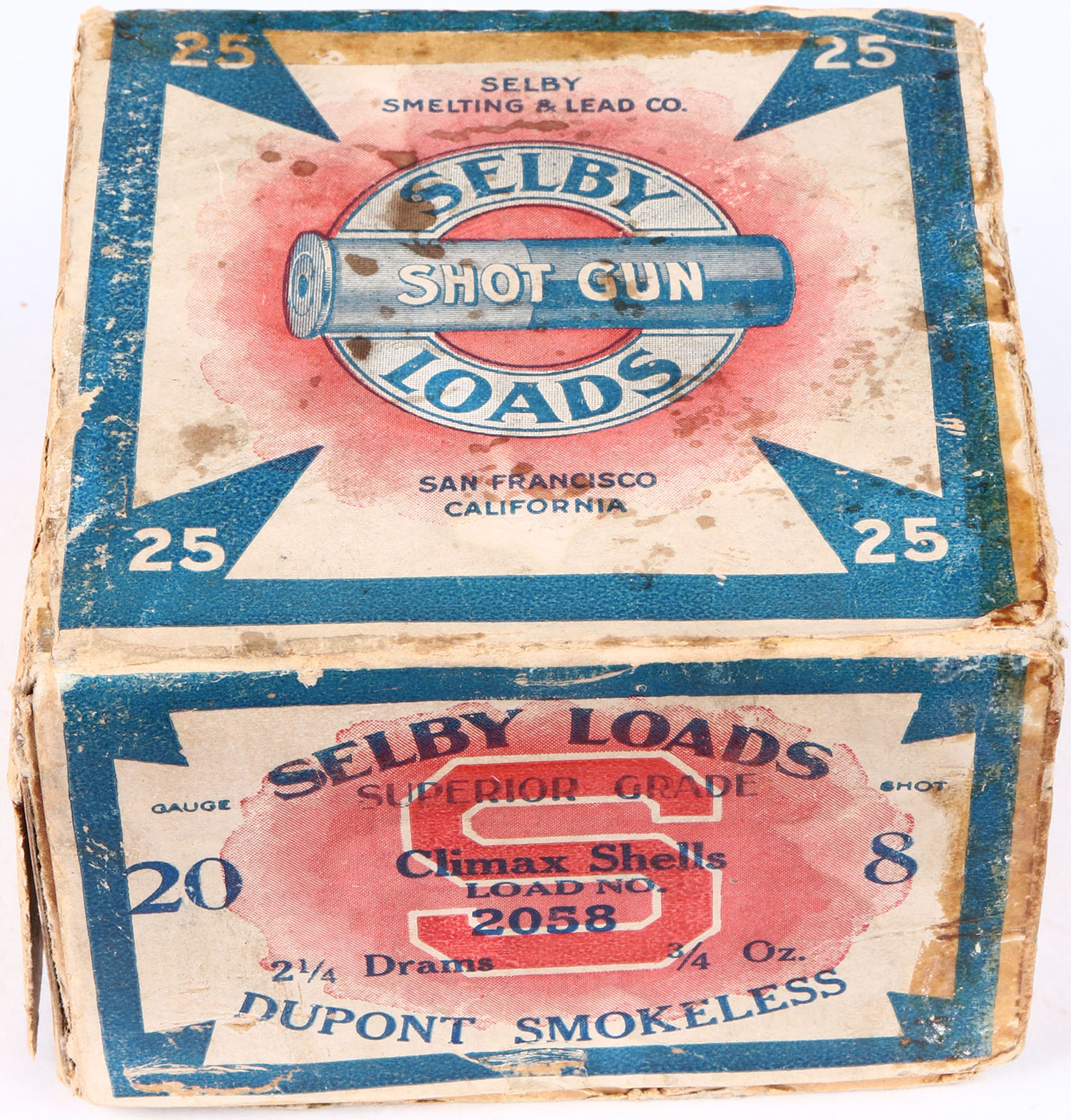SELBY, Selby Smelting & Lead Co., Selby Shot Gun Loads, Superior Grade Climax Shells, 20ga, 2pc., Full, shot size 8, buff box with blue, red & white paper label, box has seam splits, soiling, tape repair & nice colors. Shells are excellent. Grade: Very Good ++ - Value: 60 to 200