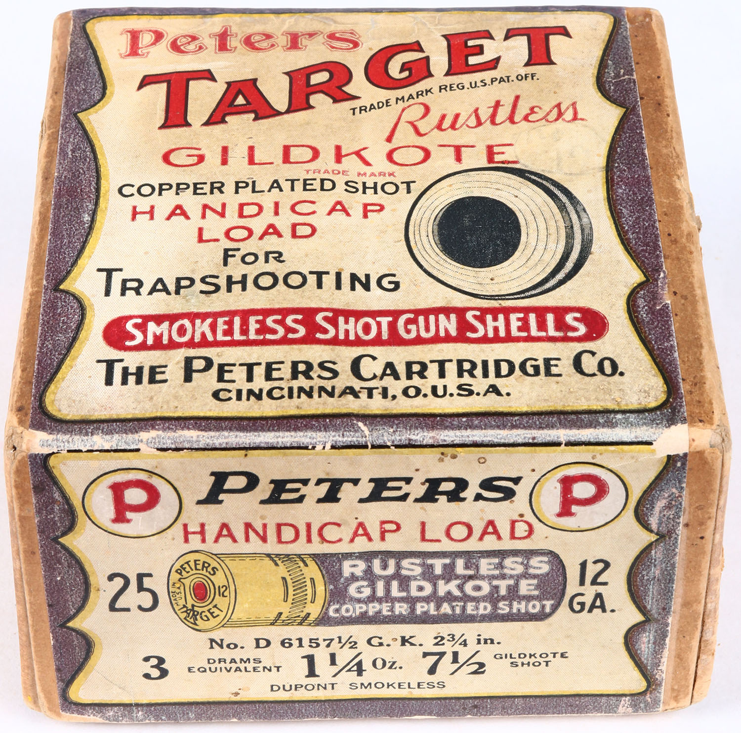 Peters Cart. Co., Target Gildkote, 12ga, 2pc., Empty, shot size 7 1/2 Gildkote Copper Plated Shot, buff box with multi-colored label that has clay pigeon on front, box has light soiling with great color to label, label 100% original.* Grade: Excellent + - Value: 2000 to 4000