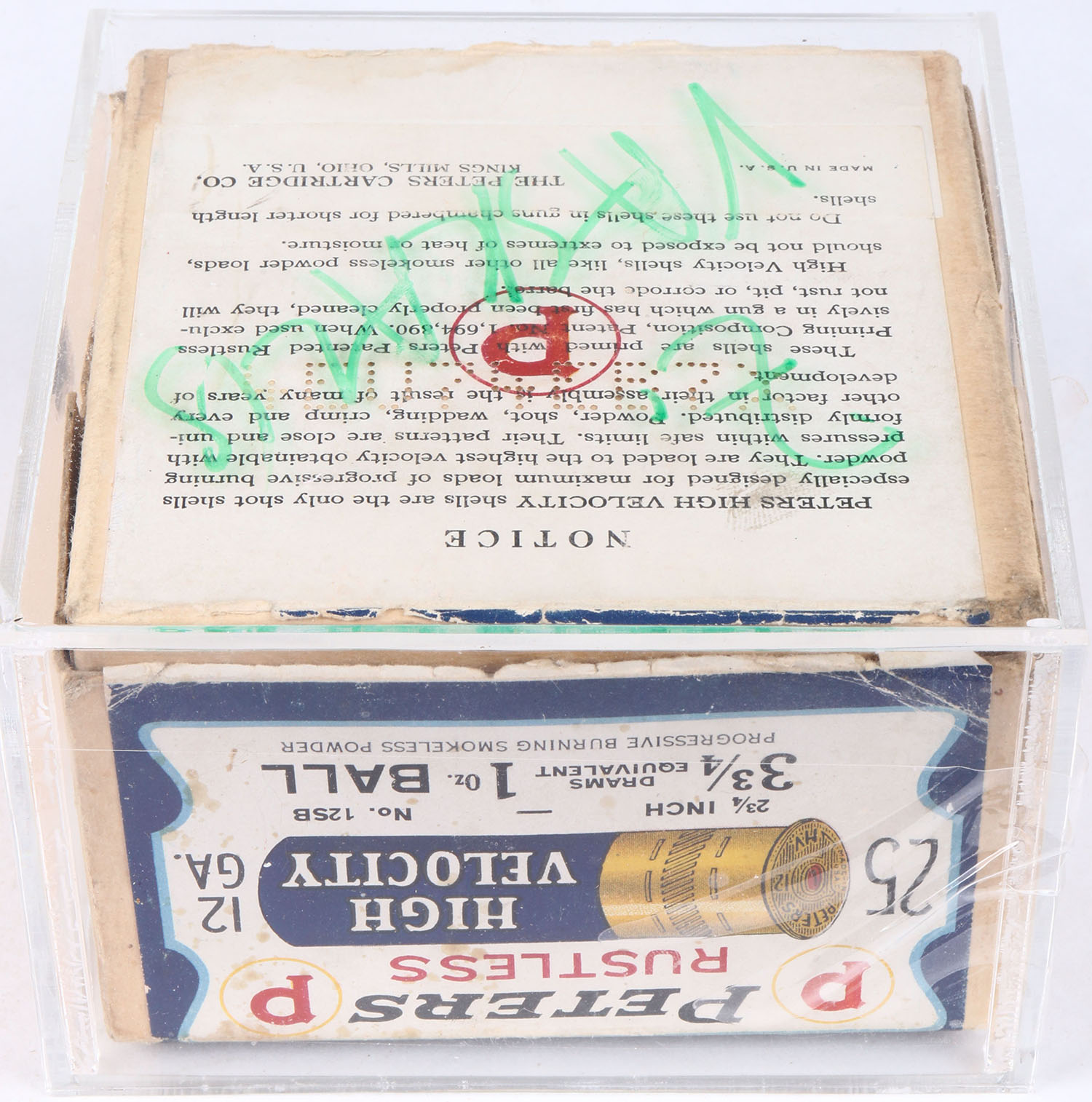 Peters Cart. Co., Blue Bill, 12ga., 2pc., Empty, shot size Ball, buff box with multi colored label that pictures Blue Bill in flight, box has scuffing, light soiling & box is solid with very good colors. With acrylic box. Grade: Excellent - Value: 50 to 250