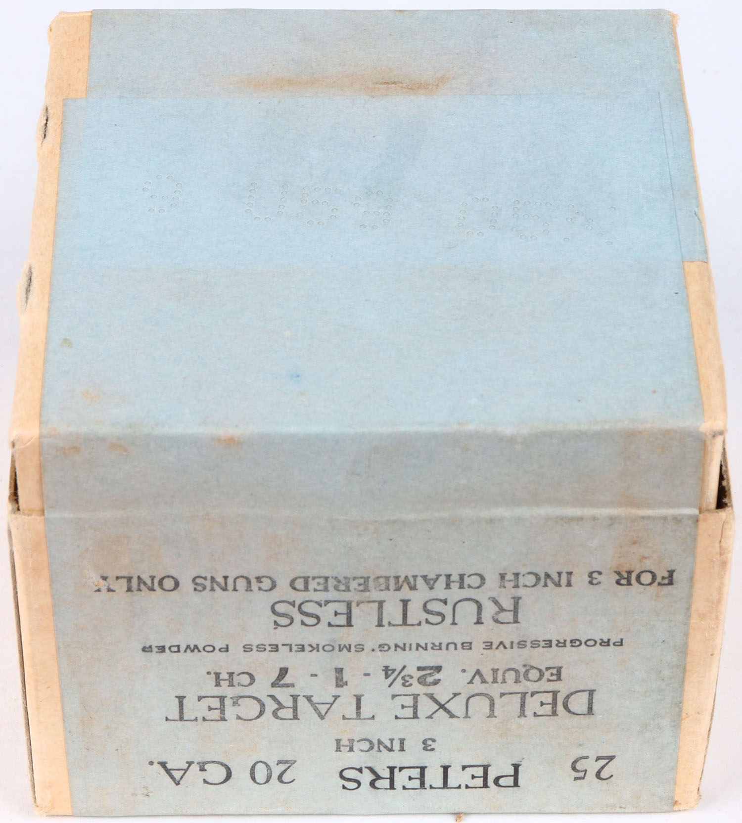 Peters, DELUXE TARGET, 20ga., 2pc., FULL & HALF SEALED, shot size 7CH., buff box with blue & black label, 3 Inch, box has some age soiling. Grade: Excellent ++ - Value: 70 to 300