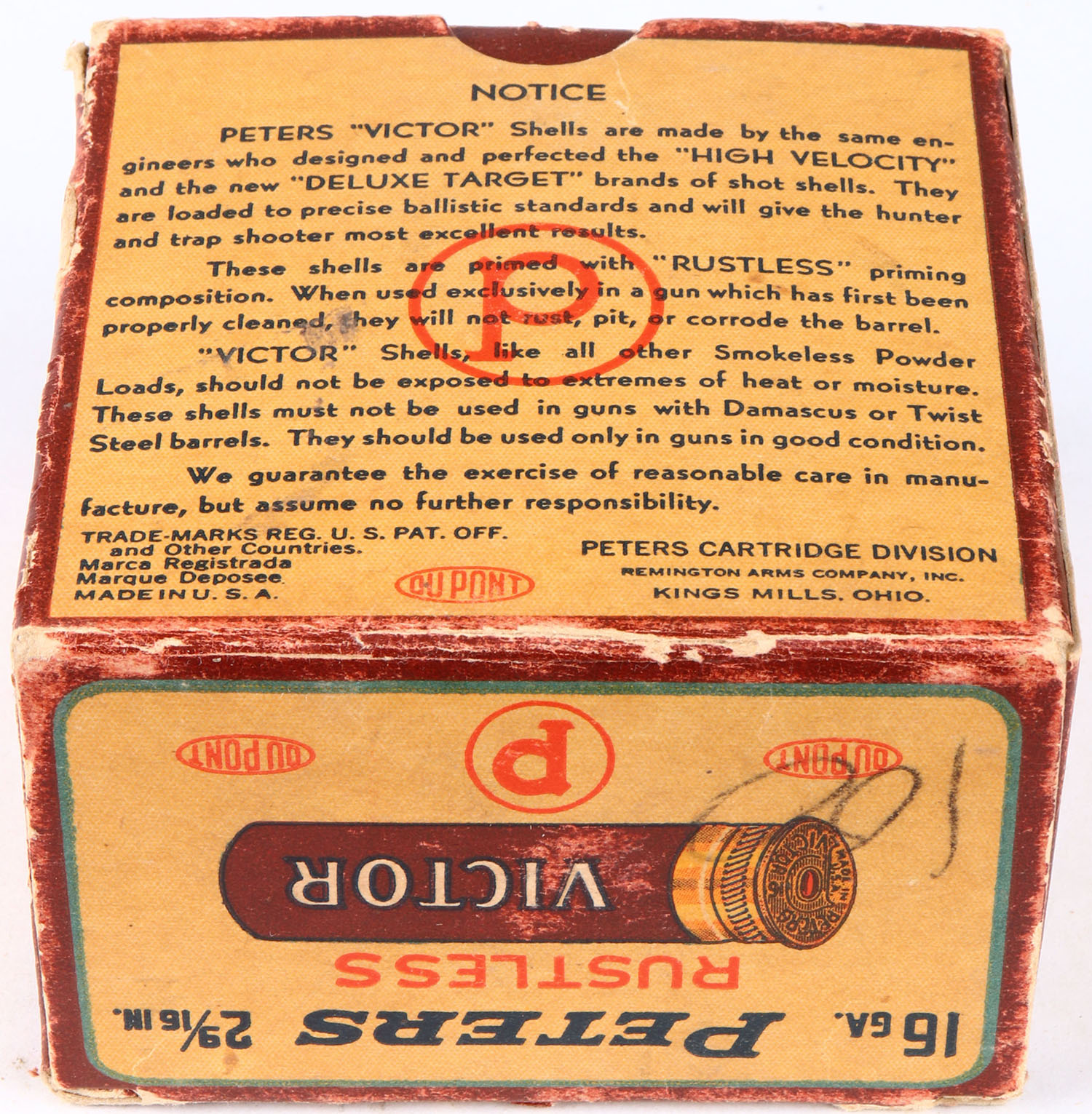 Peters, Victor, 16ga, 1pc., Full, shot size 5 CH, Maroon, cream & orange box, 2 9/16'', box has light edge wear, very nice colors, inside flap has a piece disconnected & top flap is disconnected, Shells are excellent. Grade: Very Good ++ - Value: 20 to 50