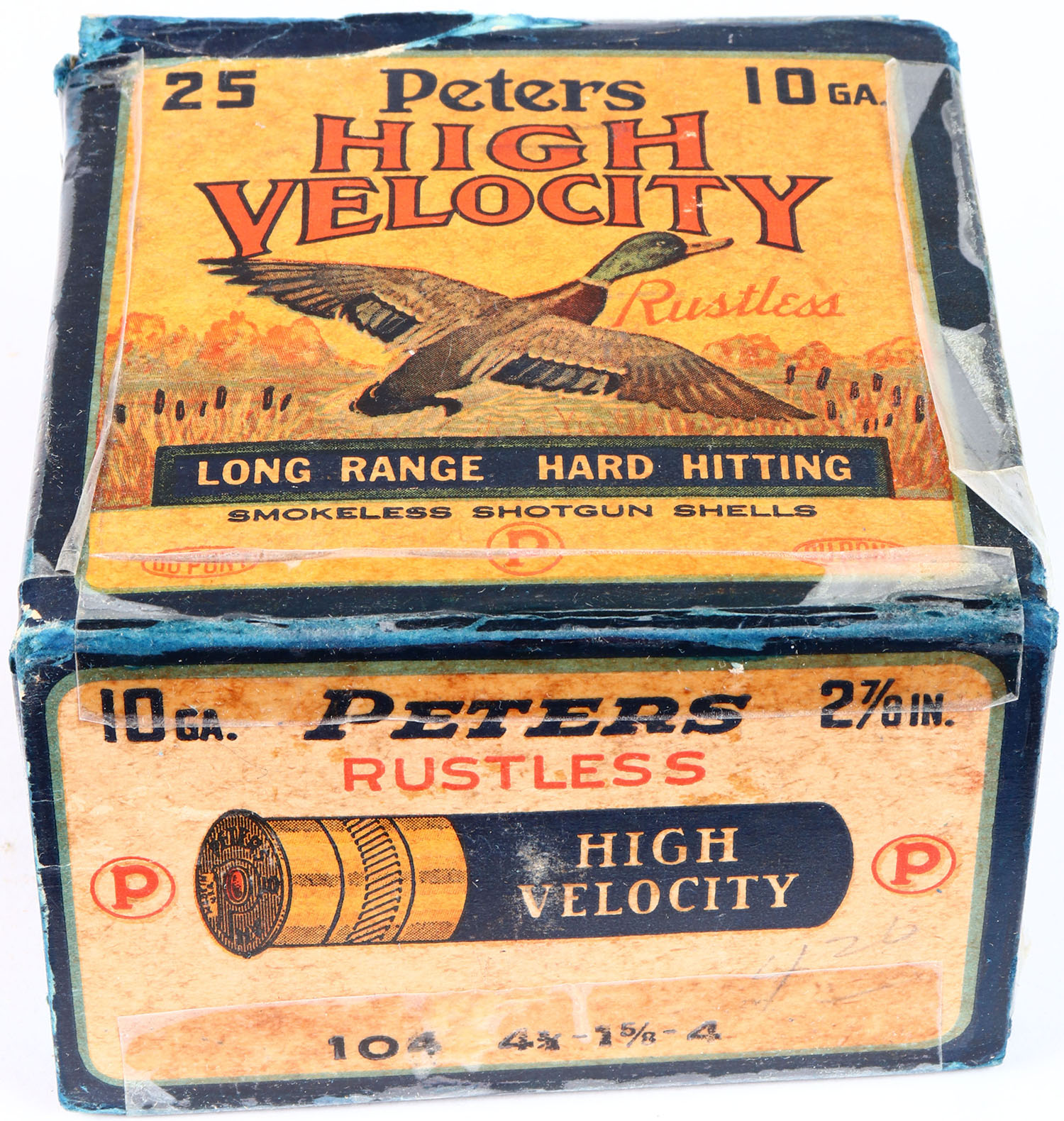 Peters Cart. Co., Bridgeport, CT, High Velocity, 10ga., 1pc., Partial 19rds, shot size 4, multi colored box that pictures mallard flying out of the marsh grass, box has tape repair with light age soiling but good color, Shells are excellent. Grade: Very Good ++ - Value: 20 to 80