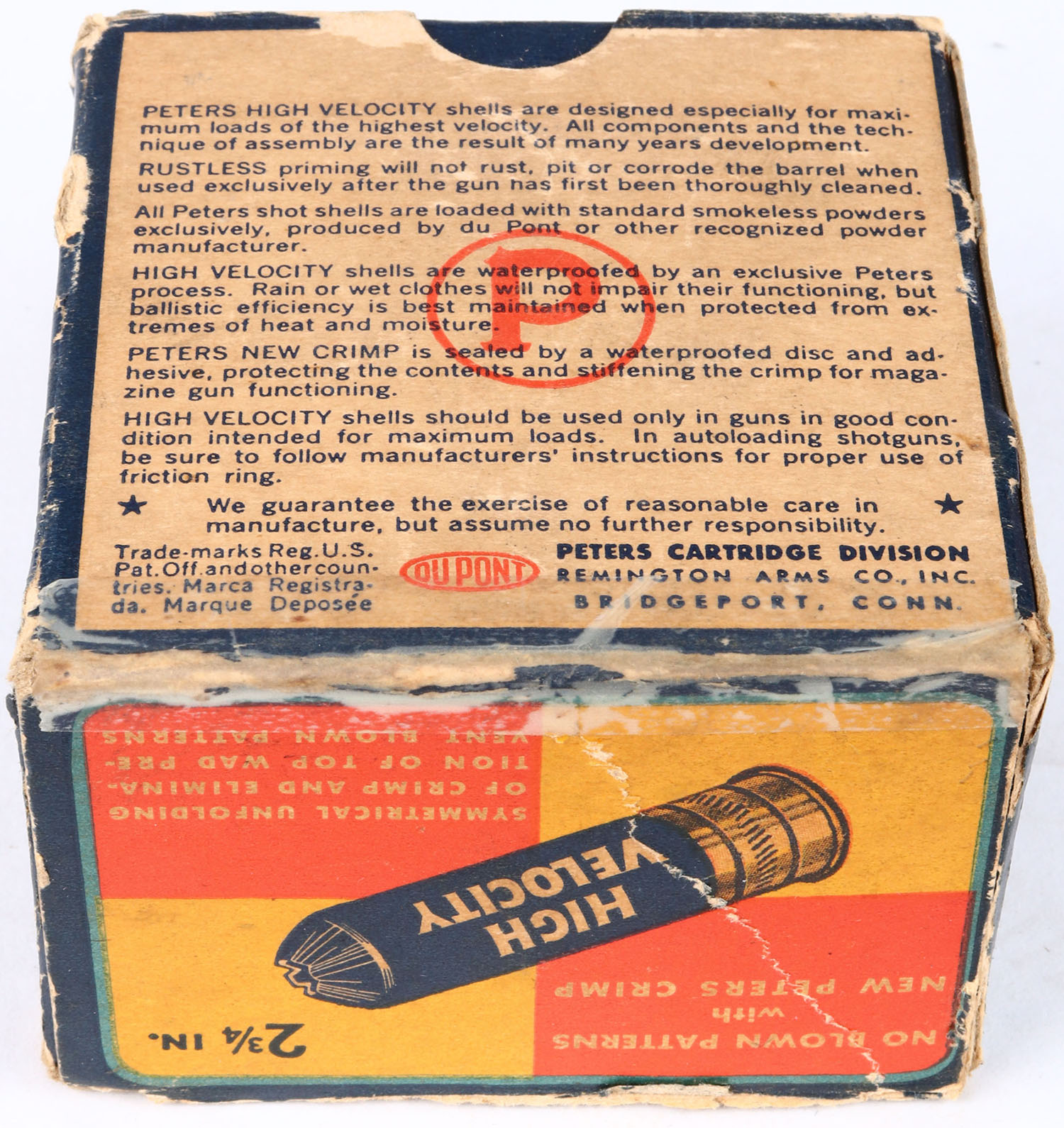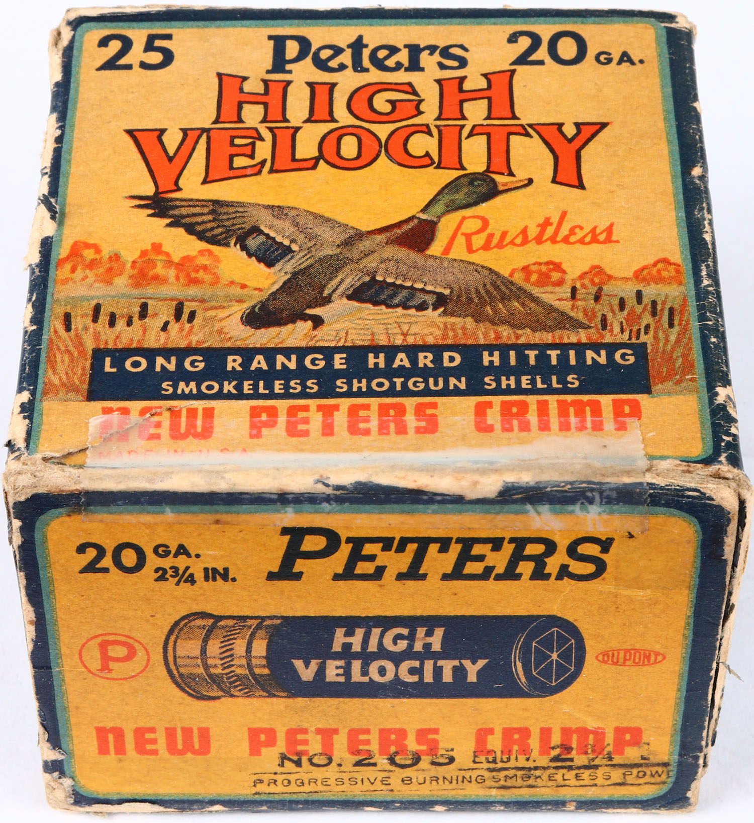 Peters Cart. Co., High Velocity, New Peters Crimp, 20ga., 1pc., Full, shot size 5, multi colored box that pictures mallard flying out of the marsh grass, paper shells, box has edge wear with top and bottom flap being held together with tape has very nice colors, shells are excellent. Grade: Very Good ++ - Value: 10 to 50