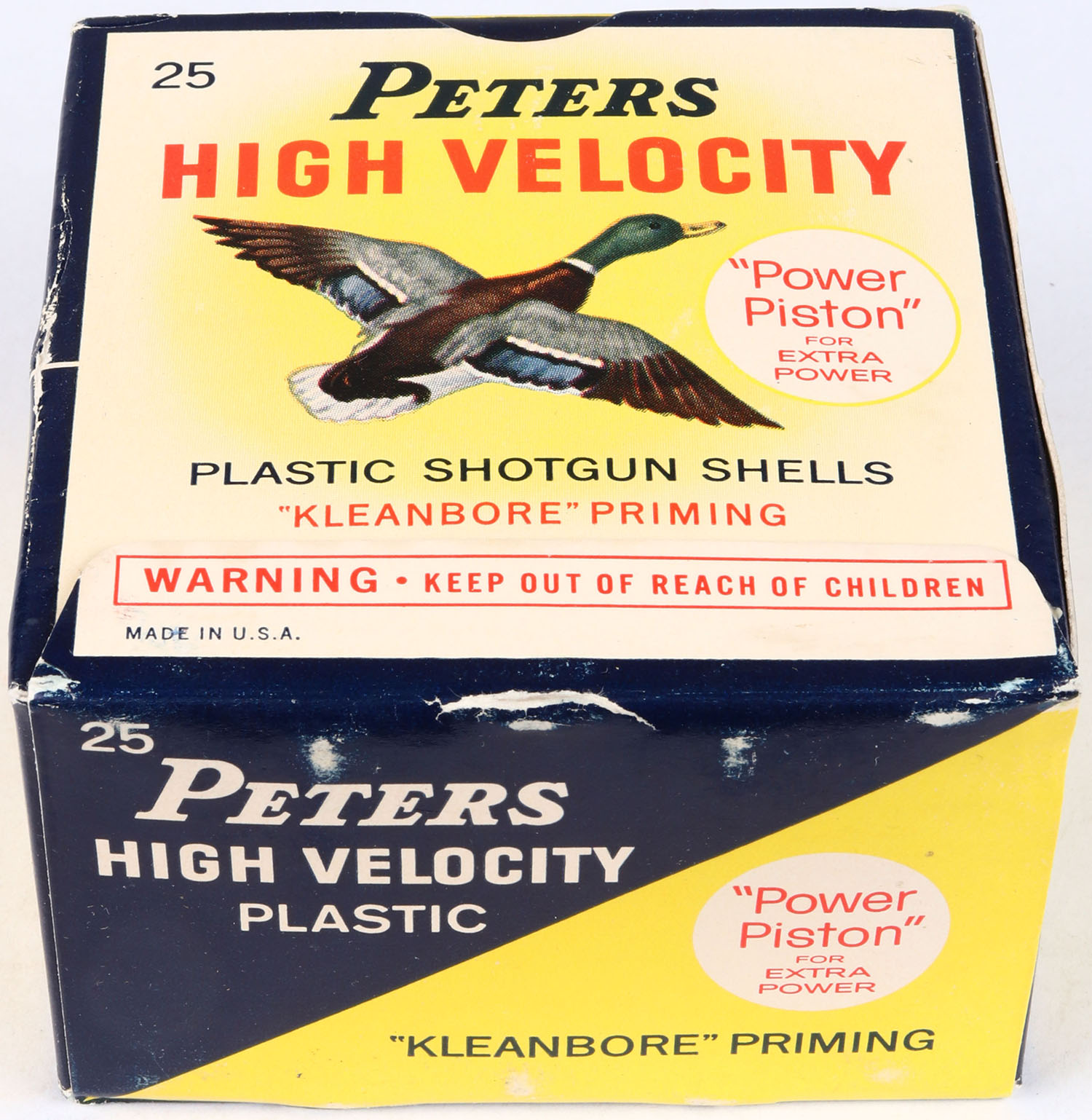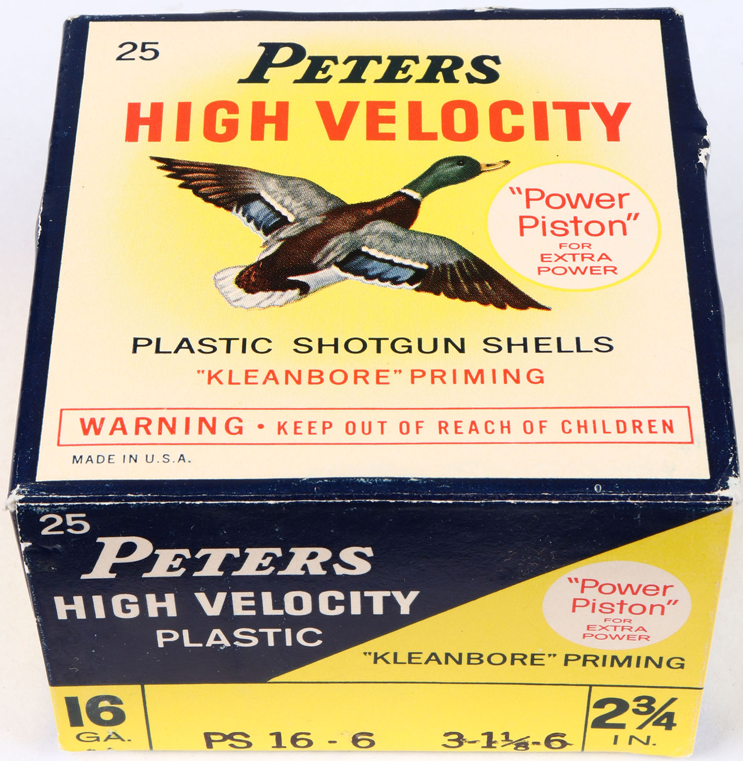 Peters, High Velocity, 16ga, 2 3/4'', 1pc., Full, shot size 6, multi colored box that pictures mallard flying, box is solid with great color, shells are excellent. Grade: Excellent ++ - Value: 10 to 40