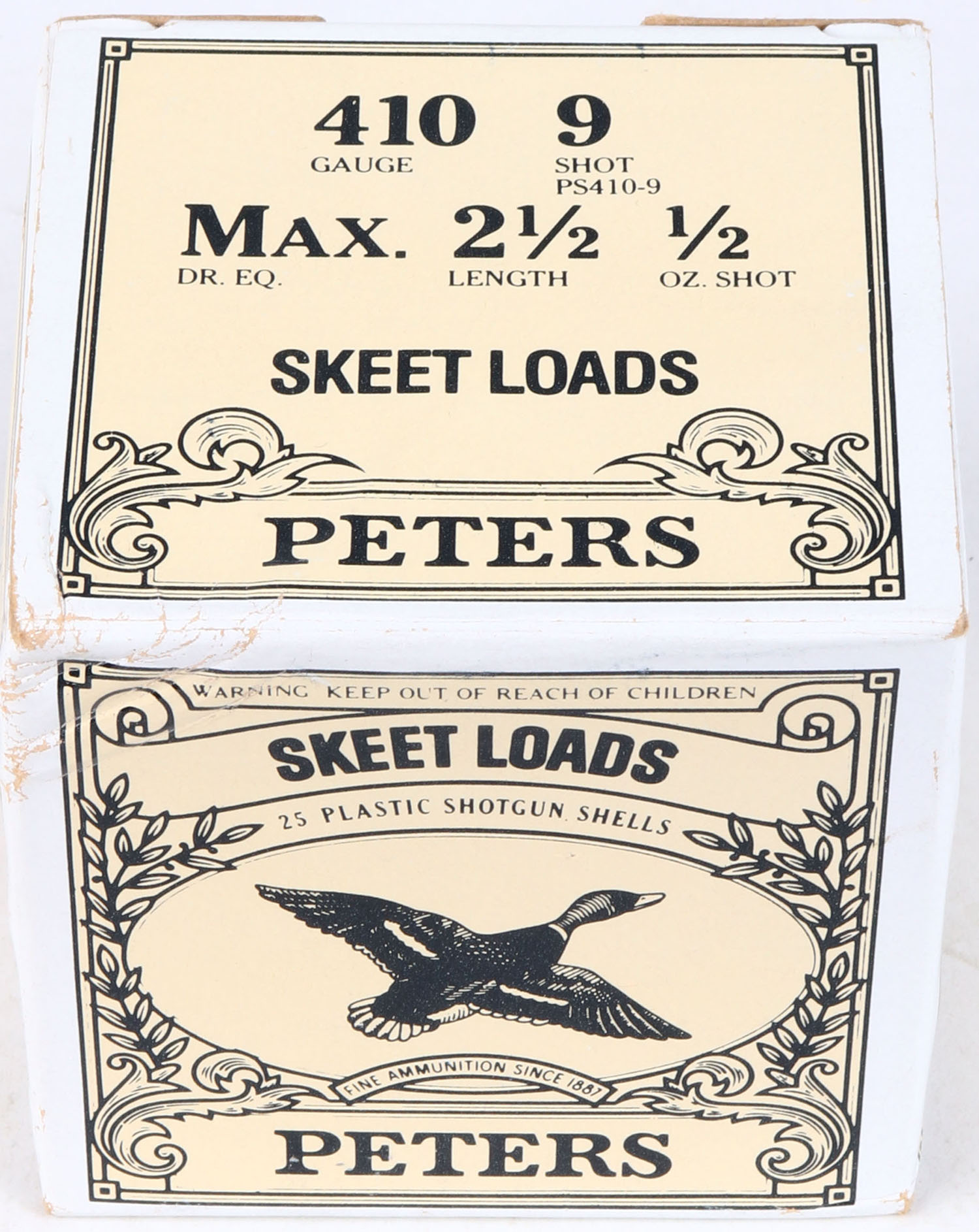 Peters, SKEET LOAD, 410ga, 2 1/2'', 1pc., Full, shot size 9, box is very solid with great color, Shells are excellent. Grade: Excellent ++ - Value: 10 to 40