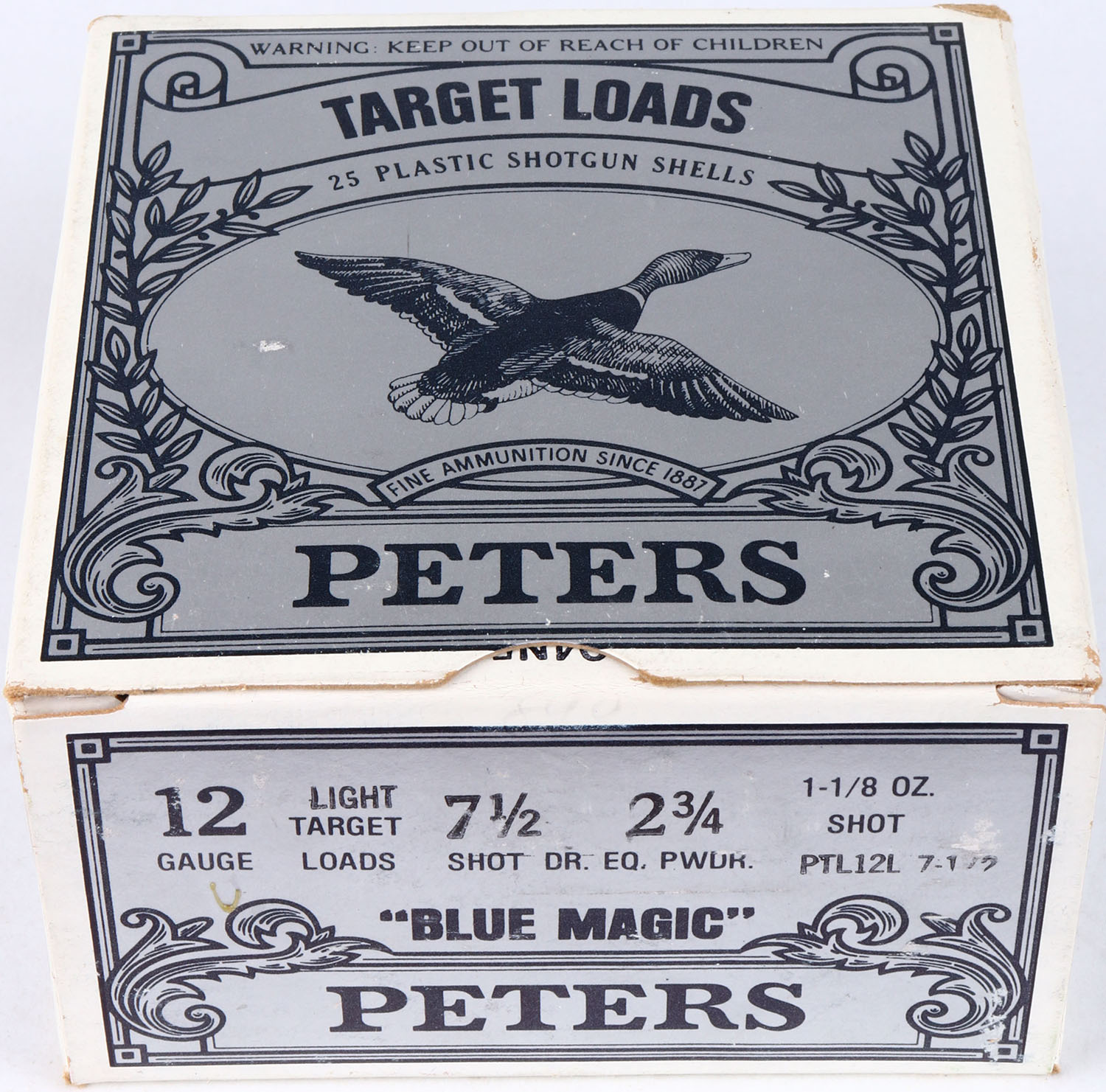 Peters, Blue Magic, Target Loads, 12ga, 2 3/4'', 1pc., Full, shot size 7 1/2, box is very solid with great color, Shells are excellent. Grade: Excellent ++ - Value: 10 to 30