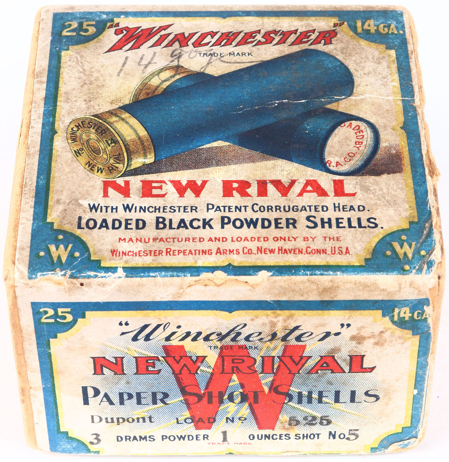 Winchester, NEW RIVAL, 14 GAUGE, 2pc., Partial 5rds, Shot Size 5, buff box with multi-colored label that pictures the two crossed shells, loaded BLACK POWDER shells, Box has seam split, age soiling, with very nice colors, Shells are good. Grade: Very Good ++ - Value: 80 to 300