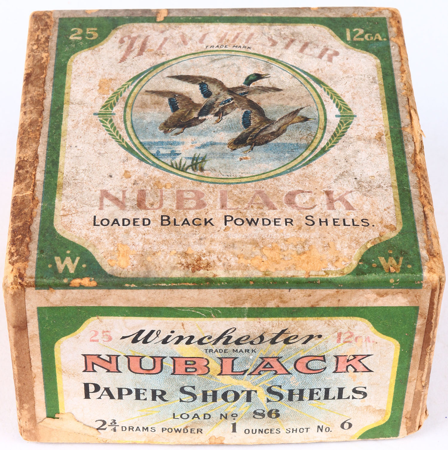 Winchester, NUBLACK, 12ga, 2pc., Empty, shot size 6, buff box with multi-colored label that pictures three mallards flying over water, Yellow shells on one side panel, Box is very solid, has edge wear with age soiling, & good colors. Grade: Very Good ++ - Value: 50 to 200