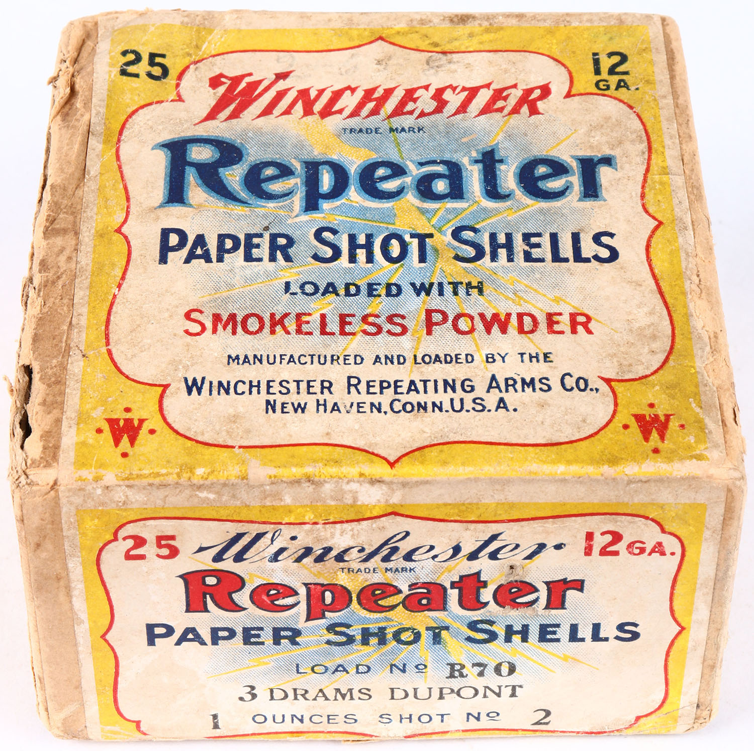 Winchester, REPEATER, 12 Gauge, 2pc., Partial 1rd, Shot Size 2, Buff box with yellow, white & red label showing lightning bolt, box has age soiling, seam splits with nice colors. Shells are very good. Grade: Very Good ++ - Value: 50 to 200