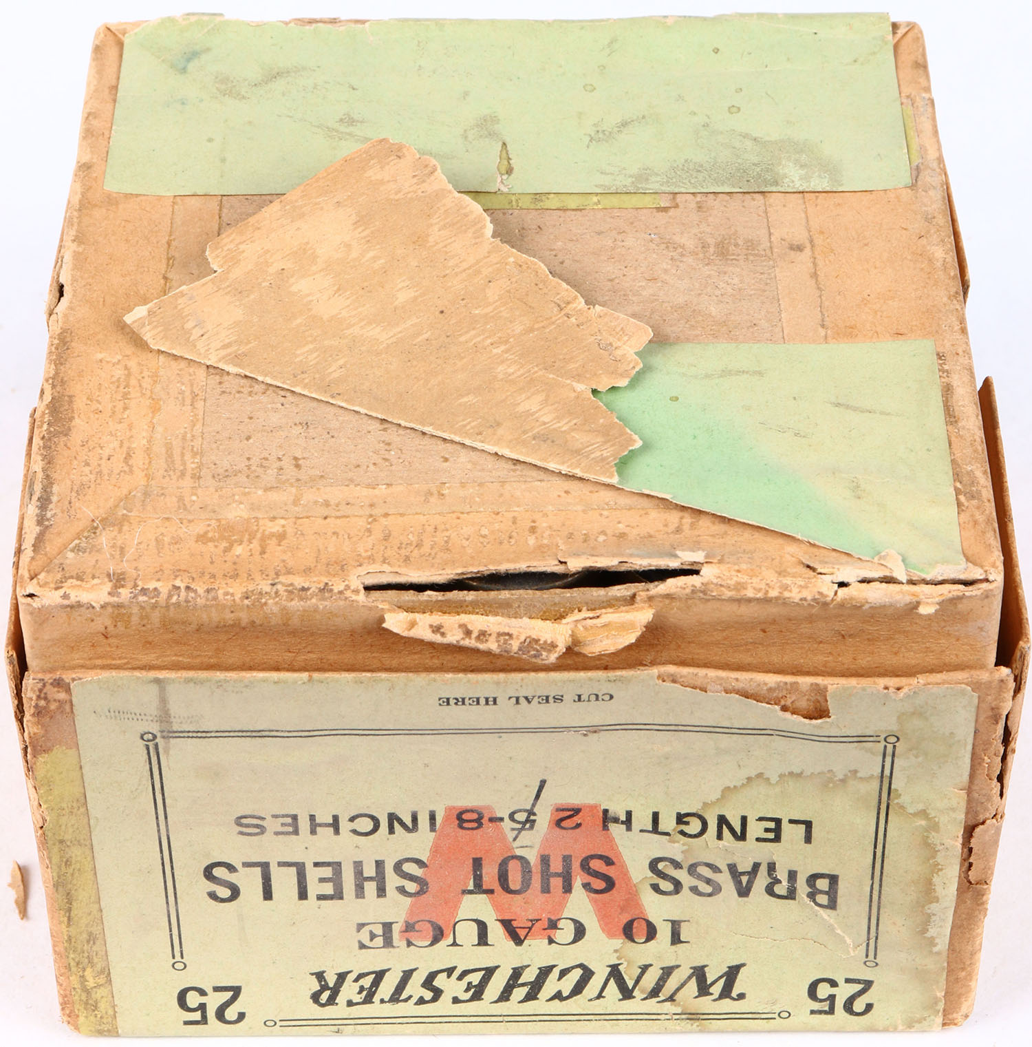 Winchester, BRASS SHOT SHELLS, 10ga., 2pc., Full, Length 2 5/8'', buff box with green, red & black label, box has seam splits with light age soiling & mild shell protrusions, brass shells are very good. Grade: Excellent - Value: 40 to 100