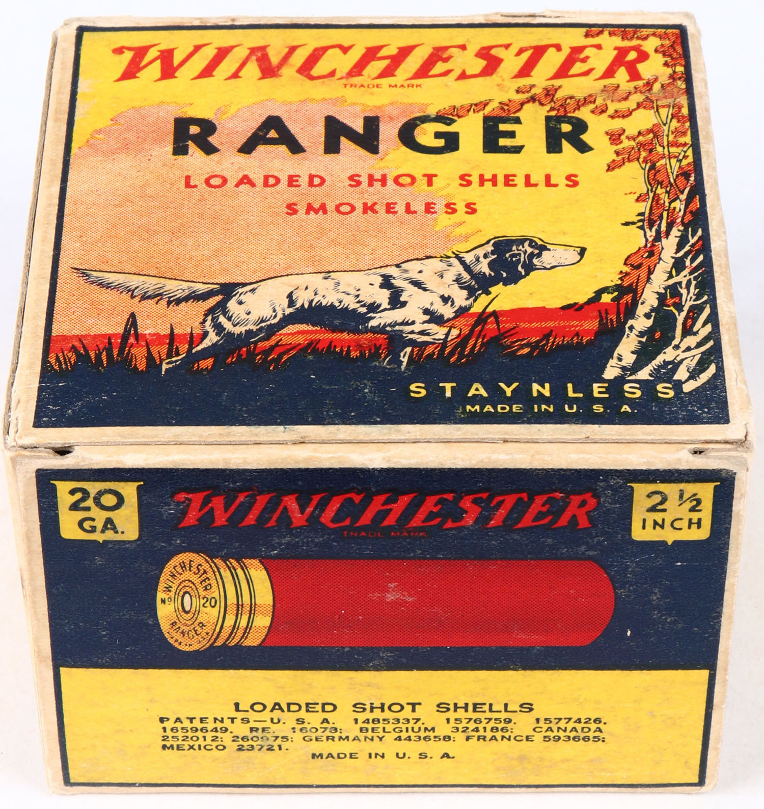 Winchester, Ranger, 20 Gauge, 1pc., Full, shot size 7, multi colored box, dog on point, shells 2 1/2'', box is very solid with top and inside flap tearing, has bright colors, shells are excellent. Grade: Excellent ++ - Value: 40 to 120