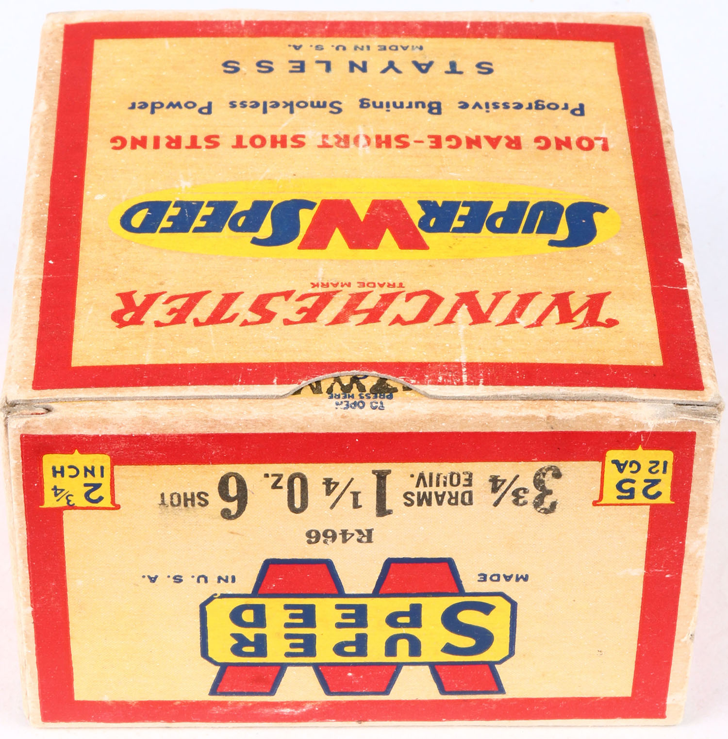 Winchester, Super W Speed, 12ga., Staynless, 2 3/4 in., 1pc., Full, shot size 6, cream, red, blue and yellow box, box is very solid with great colors & light soiling, shells are excellent. Grade: Excellent ++ - Value: 16 to 30