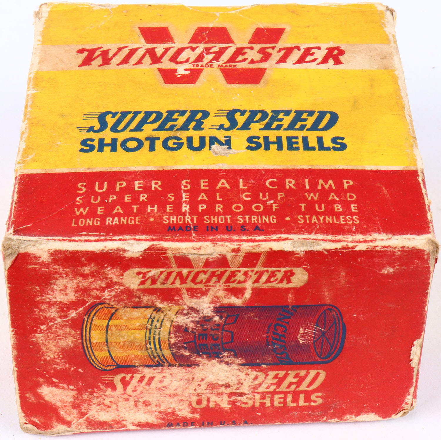 Winchester, Super Speed, 12ga., 1pc., Partial 24rds, 2 3/4''., shot size 2, red, yellow & blue box, box has scuffing, soiling, & nice colors, shells are very good. Grade: Very Good ++ - Value: 6 to 20
