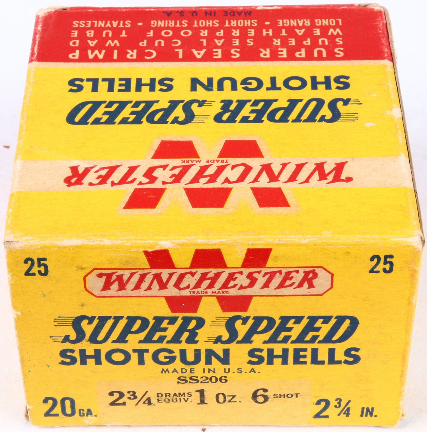 Winchester, Super Speed, 20ga., 1pc., Full, 2 3/4''., shot size 6, red, yellow & blue box, box is very solid with very nice colors, shells are excellent. Grade: Excellent + - Value: 10 to 40