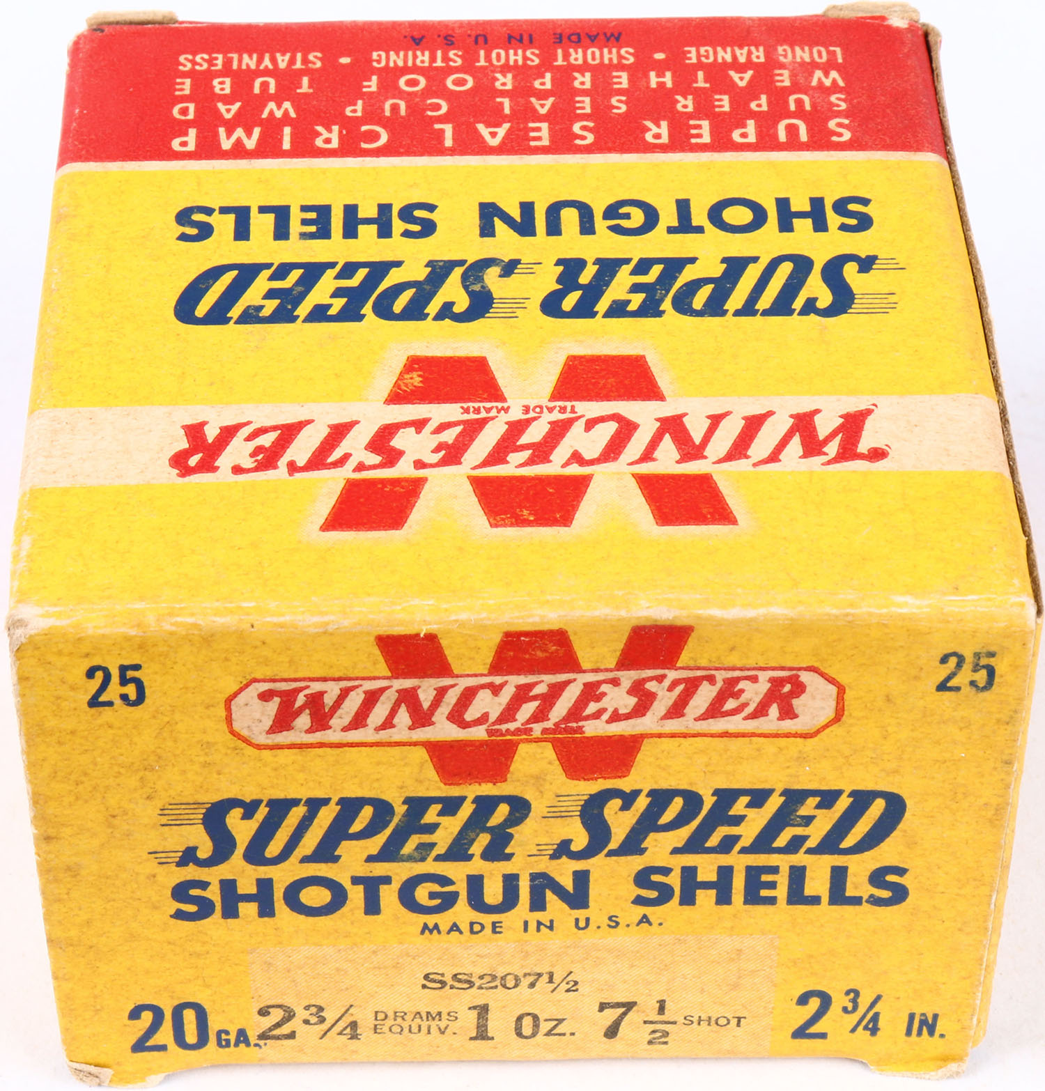 Winchester, Super Speed, 20ga., 1pc., Full, 2 3/4''., shot size 7 1/2, red, yellow & blue box, box is very solid with very nice colors & light age soiling, shells are excellent. Grade: Excellent + - Value: 10 to 40