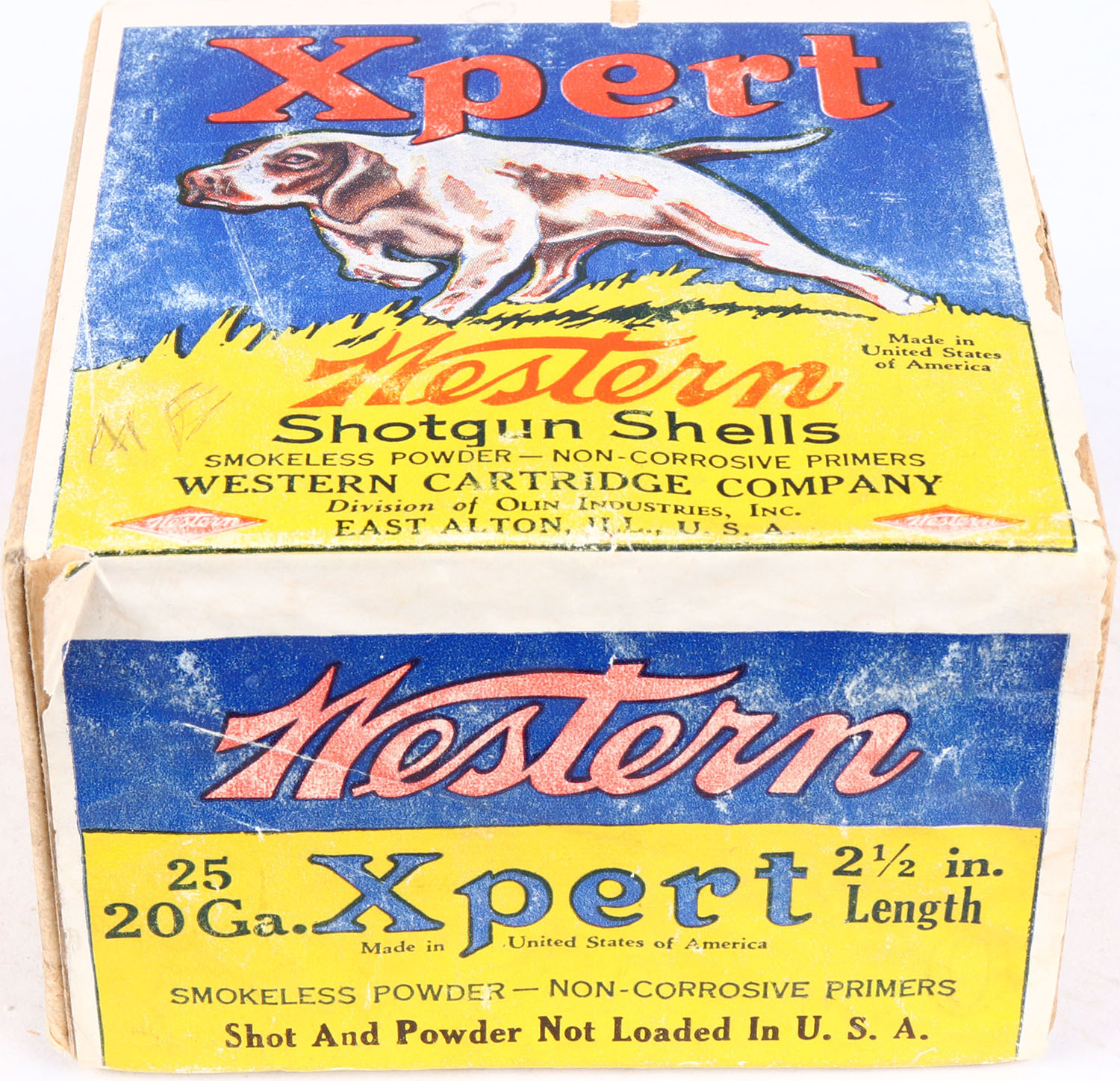 Western, Xpert, 20ga., 2pc., FULL and SEALED, shot size ?, buff box with blue and yellow paper label that pictures the pointer dog on top, box is very solid has light age soiling with great colors. Front of box says ''Shot and Powder Not Loaded In U.S.A'' but says ''Made In United States Of America'' on top of box, loaded in Mexico. Grade: Excellent - Value: 50 to 200